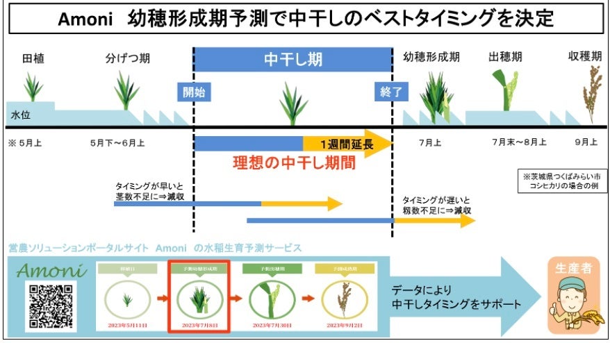 当社が取扱う Amoni 水稲生育予測を活用した、中干し延長の技術サポート