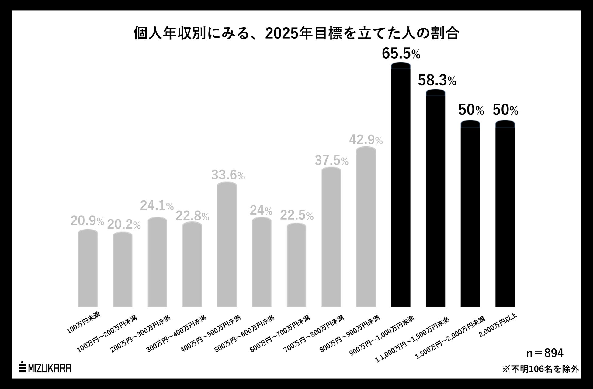 ・個人年収が高い方ほど目標を立てている傾向にあることが判明。