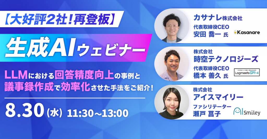 【8/30開催|生成AI活用ウェビナー】 カサナレ株式会社、AIポータルメディアAIsmiley特別企画に再登壇 ~LLMにおける回答精度向上の事例~