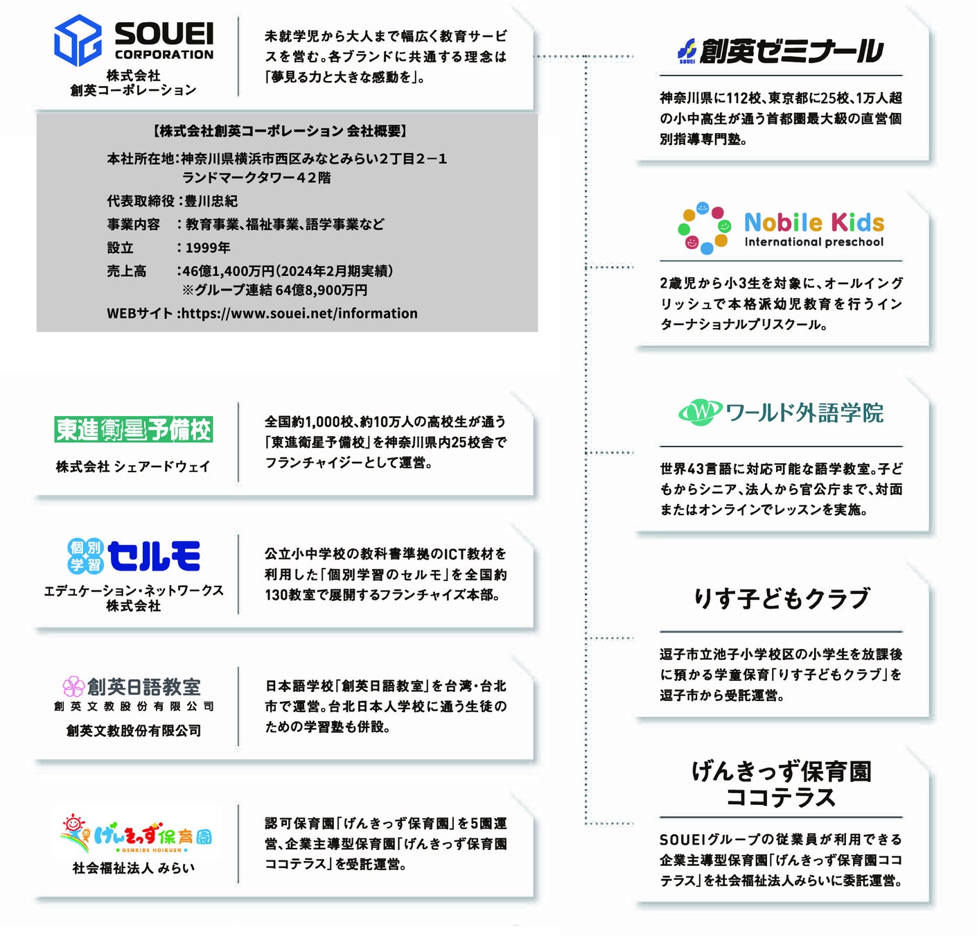 SOUEIグループの中核ブランドである個別指導塾「創英ゼミナール」は平均成長率130%、2024年9月現在で139校舎を運営(撤退校舎なし)、首都圏で最大級の直営個別指導塾です。その他、グループ各ブランドにて、幼児から社会人まで幅広い教育事業・教育サービスを提供しています。合格や学力向上だけにこだわらず、生徒の「人としての成長」を大切に、事業運営を行っています。