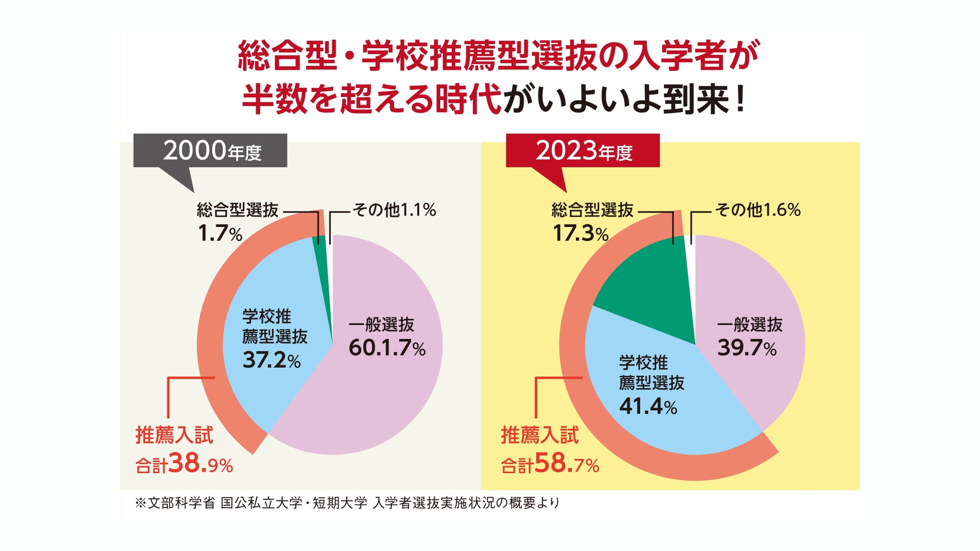 2023年度の大学入試では全大学入学者定員の50%以上が推薦系入試での入学者となっており、今後もこの傾向は強まる見込みです。