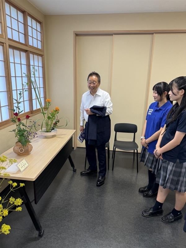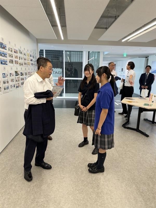 本校生徒が鈴木区長をご案内し、各展示物をご覧いただいたほか、鈴木区長から生徒たちへ温かいお言葉や激励をいただきました。とても緊張した様子の生徒たちですが、鈴木区長からいただいたお言葉に非常に感激しておりました。