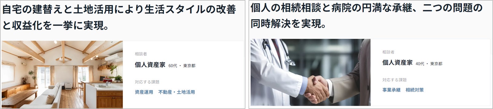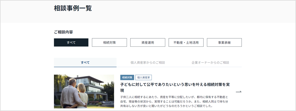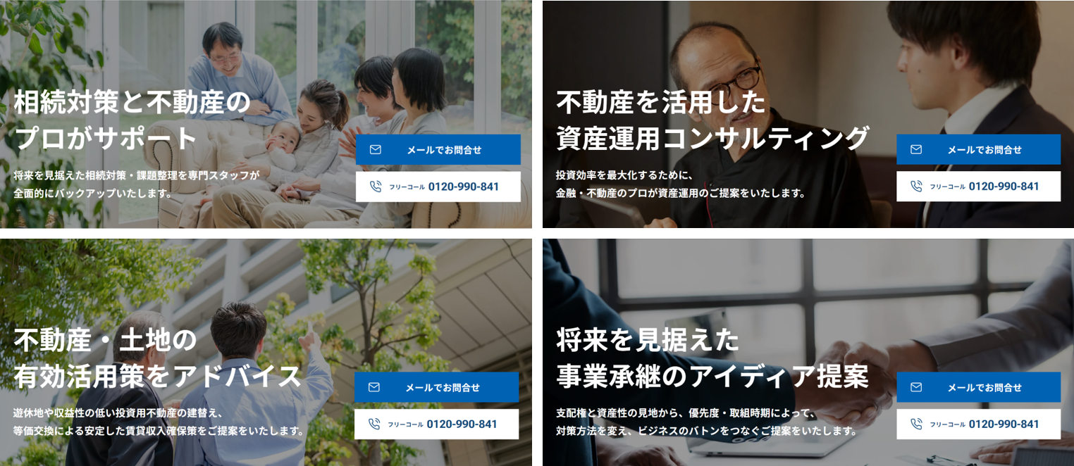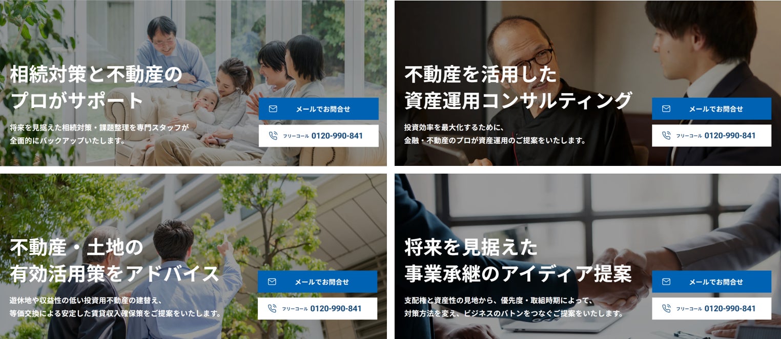 資産運用の重要性が高まる昨今において、お客様から相談いただく課題は様々です。その中で、「相続対策」や「資産運用」、「不動産・土地活用」、「事業承継」といった、個人資産家・企業オーナー様の抱える主な課題を切り口として、不動産を通じた解決へ導く情報を分かりやすくお届けすることができるWEBサイトとなっております。