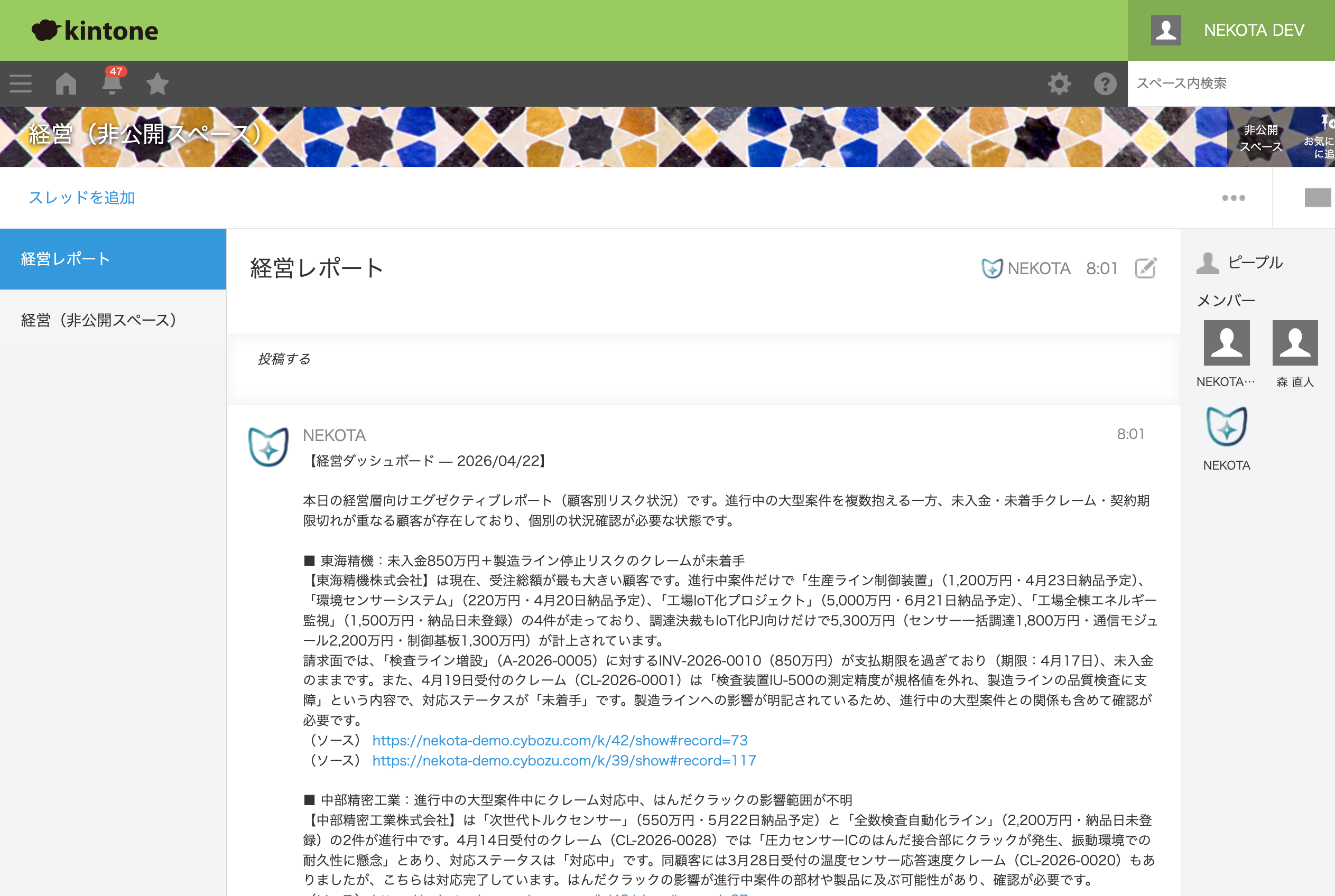 NEKOTA for kintone は、kintone上のユーザーとして動作するAIサービスです。kintoneアカウントを1つ追加するだけで導入でき、蓄積データを「行動を促すリマインド」と「意思決定に使えるサマリー」に変換して届けます。