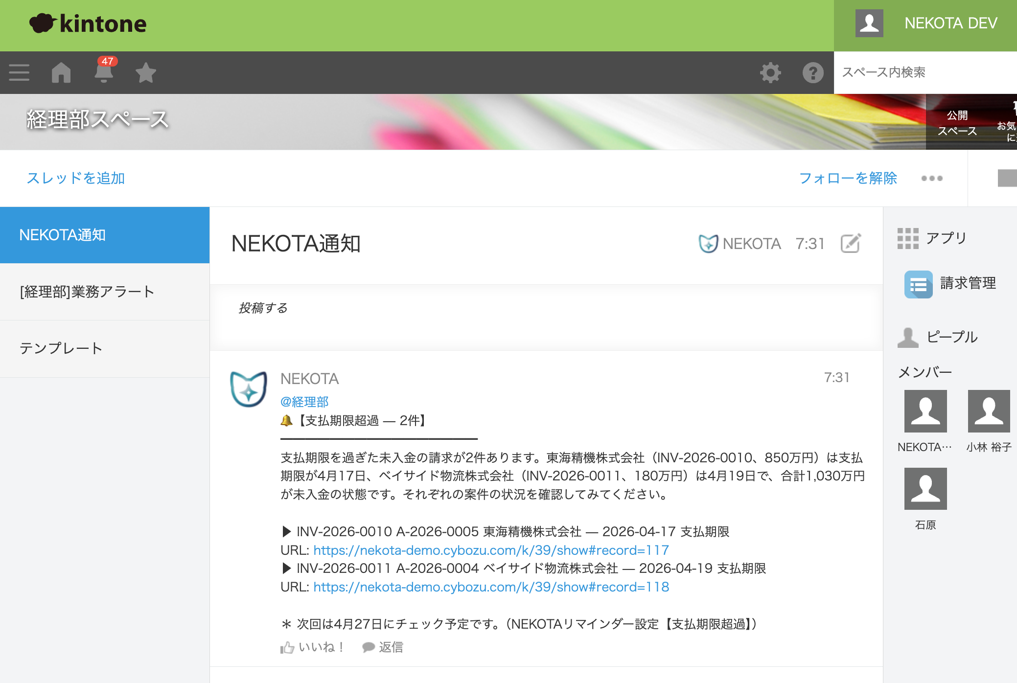 kintoneアプリの一覧条件に合うレコードを検知し、対象者へスペーススレッドで@メンション投稿します。通知にはレコードの状況と次に取るべきアクションが含まれるため、受け取った人はそのまま行動に移せます。承認待ち、未対応、期限超過——kintoneに入力されたデータの中から「止まっている仕事」を見つけ出し、必要な人に届けて業務を前に進めます。