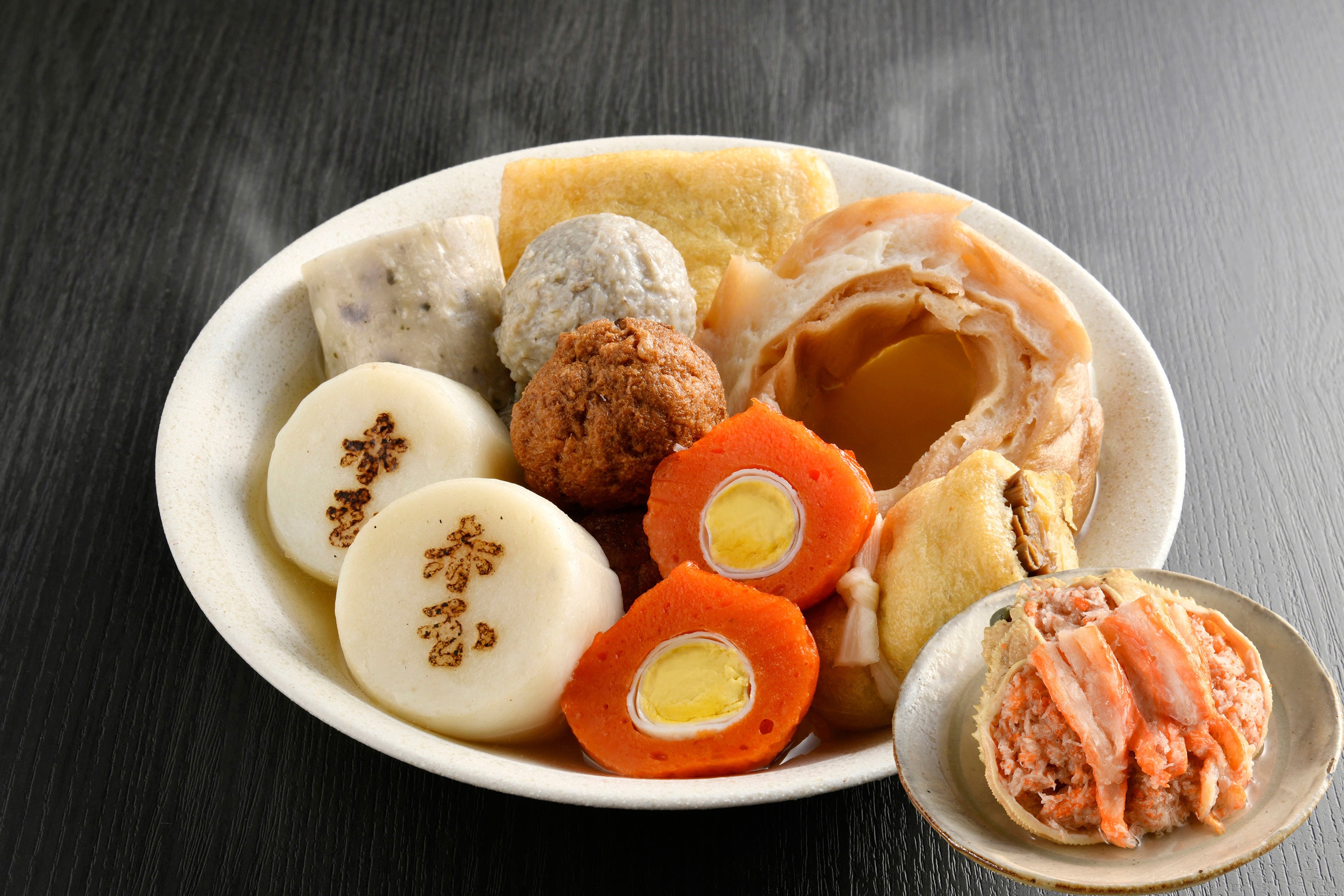 〈金澤おでん 赤玉本店〉金沢おでん8種とカニ面セット(カニ面・車麩・肉いなり・赤玉ばくだん・信田巻・金時草湯葉巻×各1、肉団子・にぎすつみれ・海老しんじょう×各2 計12個、出汁500ml) ★各日30セット限り 6,151円