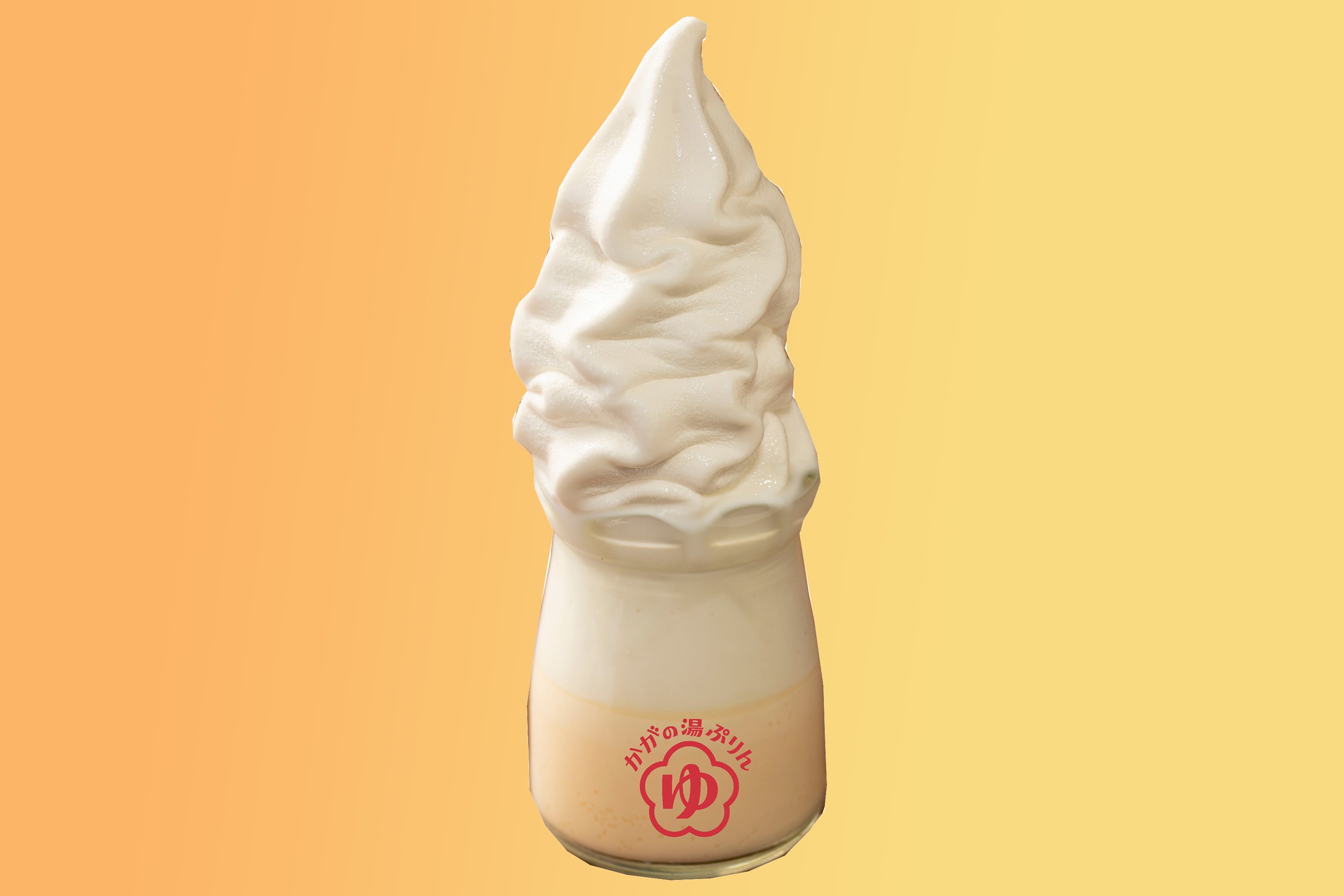 〈かがの湯ぷりん〉湯けむりぷりんソフト(1個)680円
