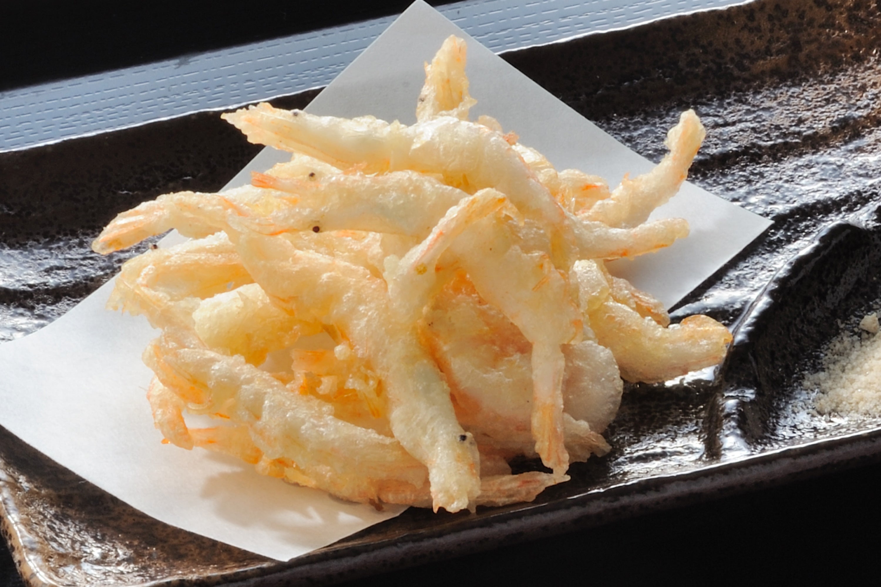 富山県の名産白えびを贅沢に天ぷらで。小さすぎず、えびのうまみ・あまみを存分に楽しめます。