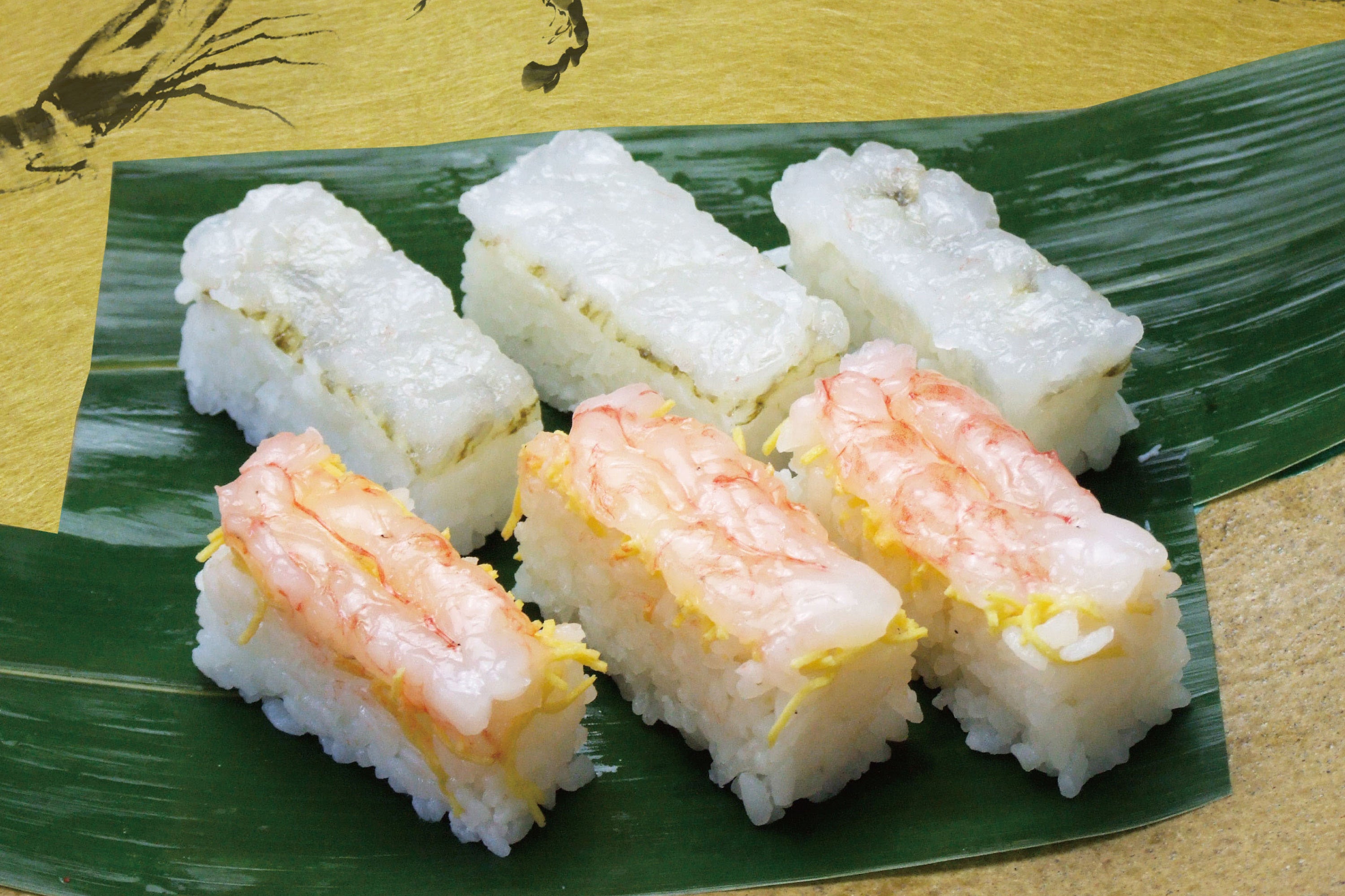 とろけるような甘みが楽しめる、白えびと甘えびの押寿司食べ比べ。