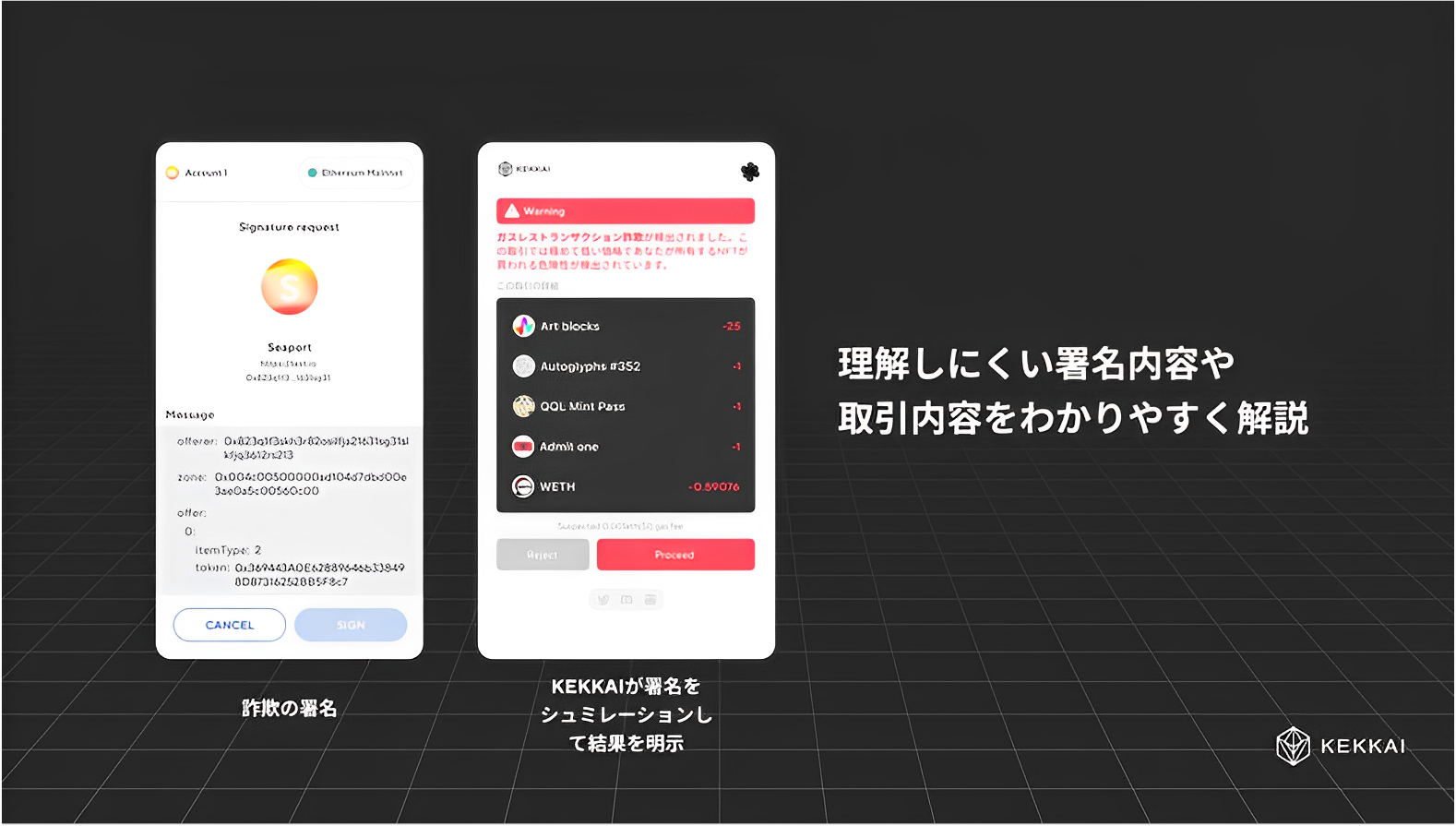 Metamask等のウォレットがトランザクションを実行する前に、KEKKAIがシステム内で取引をシミュレートし、結果を明示します。詐欺被害の多くは気づかず詐欺取引を自分から実行してしまったというケースであり、それに対してKEKKAIでは危険な操作やコントラクトが検出された時には警告が表示されます。