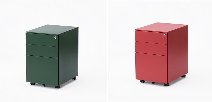 取っ手位置を左右側面にする事でデザイン性が高く、どんな空間にも馴染むシンプルなデザインのワゴンキャビネット。合わせやすいグレー、オフィスなど空間を彩るグリーンとダルレッドの3色展開です。