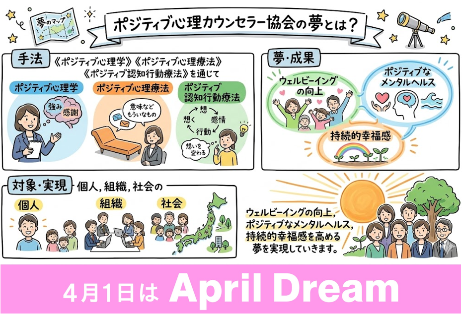 当社は、4月1日を夢を発信する日にしようとするApril Dreamに賛同しています。このプレスリリースは「一般社団法人ポジティブ心理カウンセラー協会」の夢です。