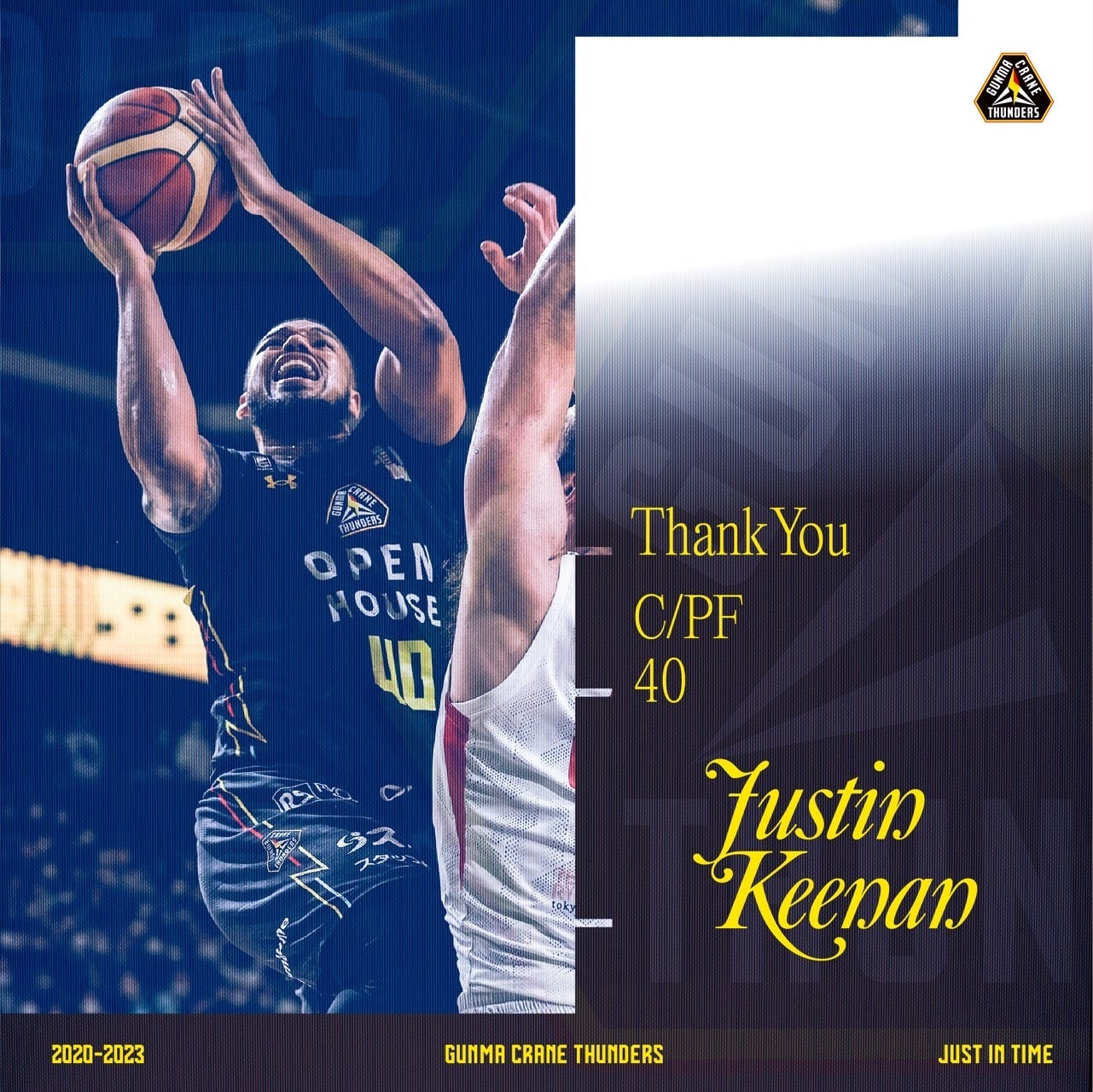 この度、群馬クレインサンダーズでは、契約満了のため、#40 ジャスティン・キーナン選手が退団することとなりましたのでお知らせいたします。