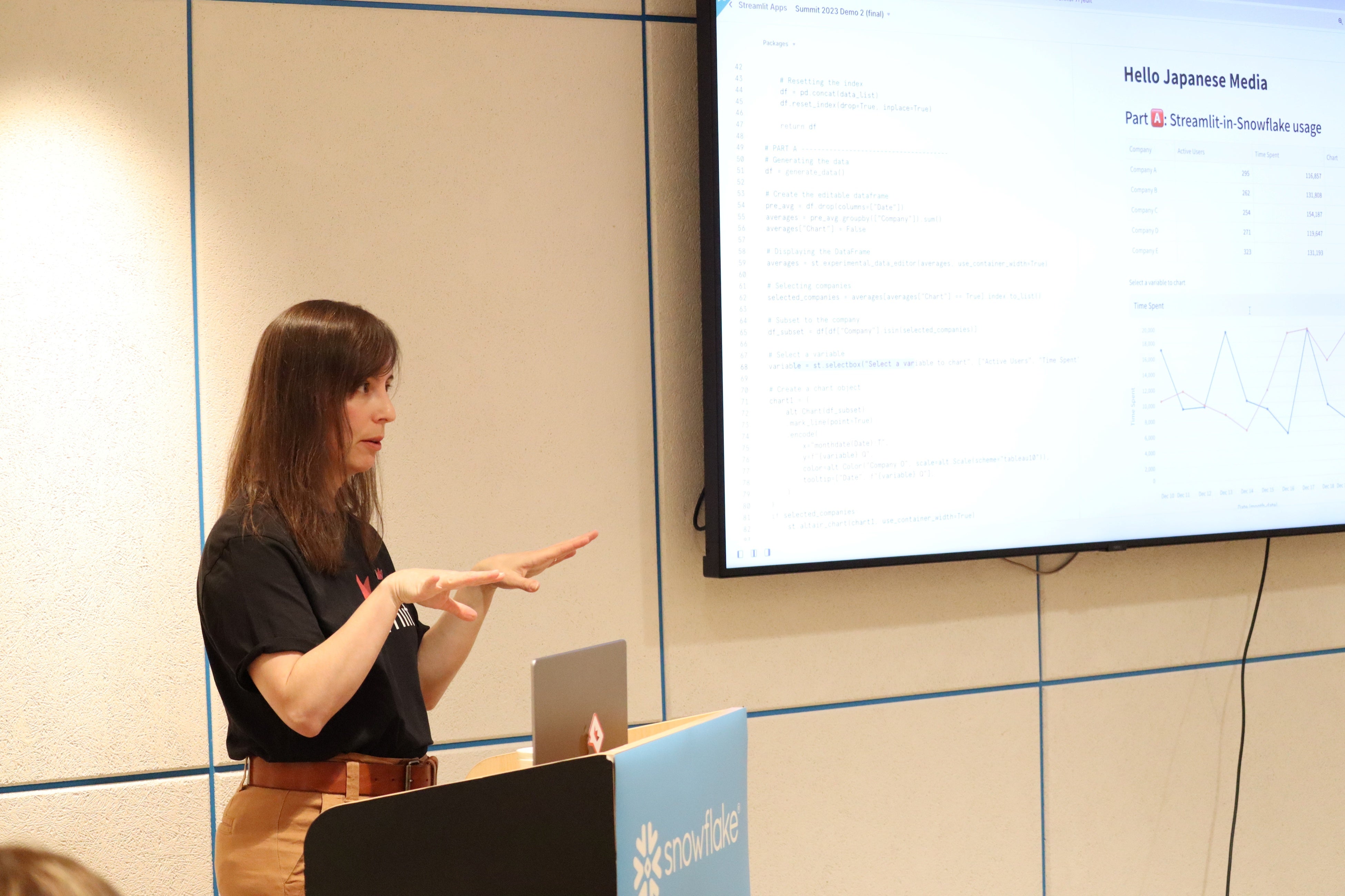 Amandaは続いてSnowflakeとの相乗効果について、「Streamlitはアプリケーションの構築を容易にする。Snowflakeはデータのセキュリティを保ち、アプリケーションをチームとともに安全に共有できる」と述べ、イタレーションを速く重ねることができる点を強調しました。さらに、50行のコーディングが1行で済む点や、Streamlitライブラリのダウンロード数は4000万を超えフォーチュン50社うち80%がStreamlitを使用している点など成果を紹介しました。