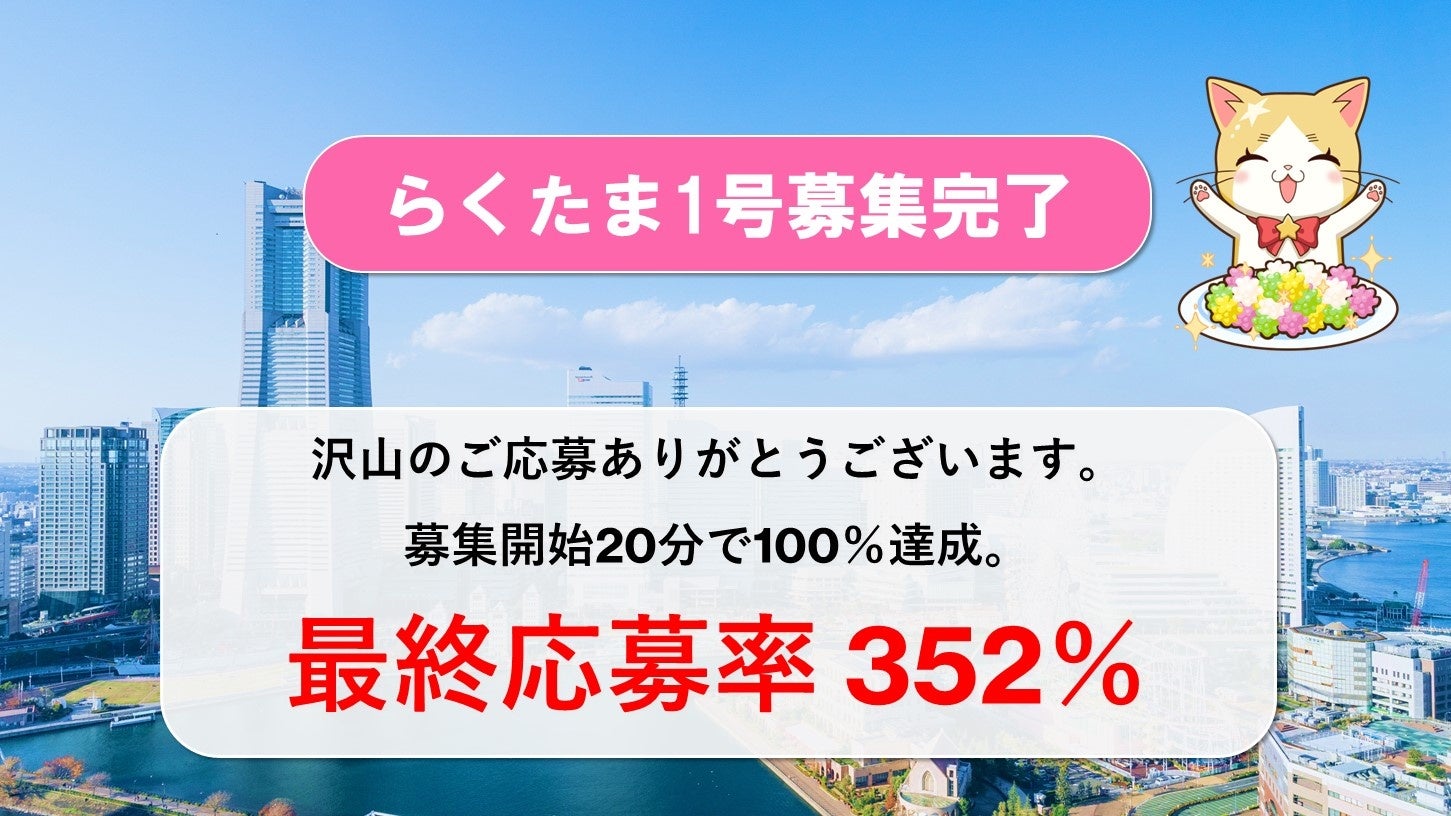 今後、2024年5月より、『らくたま2~4号ファンド(総額約1.3億円募集)』を随時募集開始していきますので、らくたま1号で出資に至らなかった方、らくたまを新規にご検討いただける方は、是非、ご参加頂ければ幸いです。