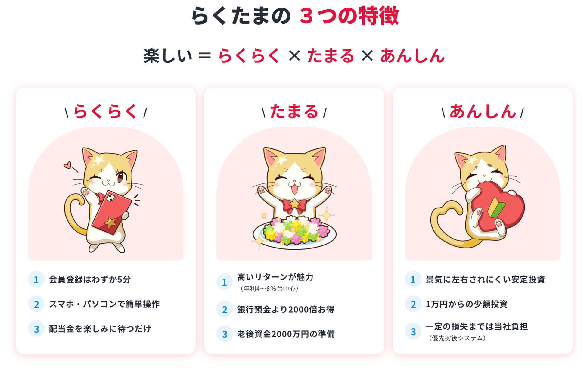 『らくに、たまる』をコンセプトに、不動産知識や投資経験が少ない方でも、1万円から安心して参加できるファンドの組成を目指します。