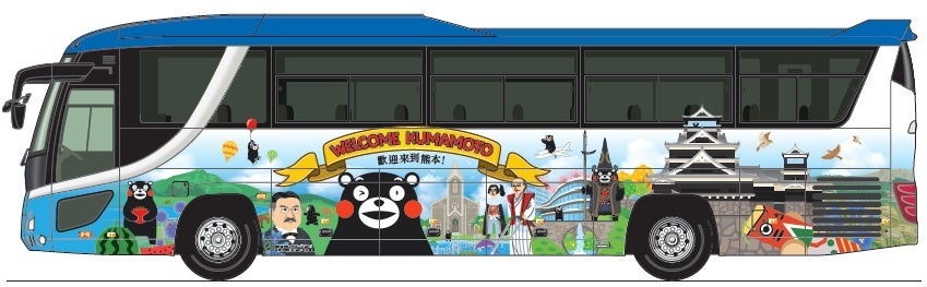 今回、貸切バス車両5台にくまモンをはじめ、熊本県の観光地や特産物、そして熊本にゆかりのある偉人を描き、国内外のお客様にもお喜びいただけるデザインを施したラッピングバスをご準備しました。