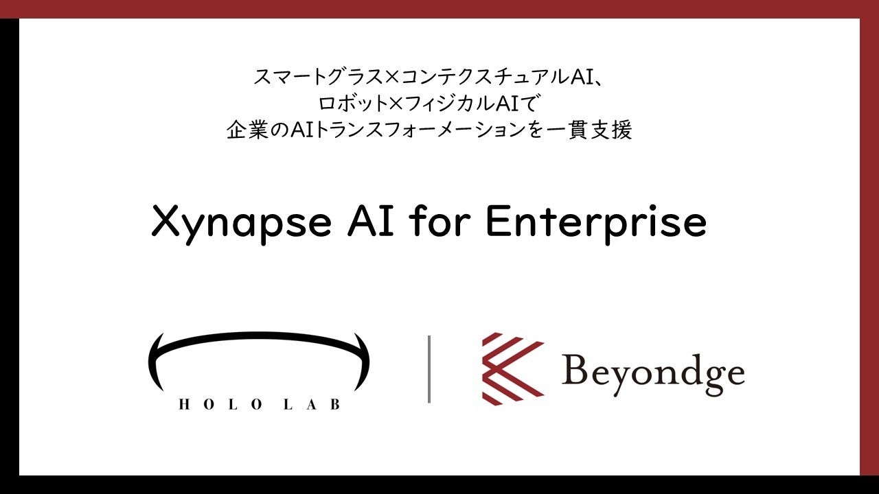 Beyondge株式会社(本社:東京都渋谷区、代表取締役CEO:野上 隆徳、以下Beyondge)は、XR・3Dデータ、AI活用に強みを持つ株式会社ホロラボ(本社:東京都品川区、代表取締役CEO:中村 薫、以下ホロラボ)と連携し、スマートグラスとコンテクスチュアルAI、ロボットとフィジカルAIを活用することで、企業の全社的なAIトランスフォーメーション(AX)を一貫して支援する共同サービス「Xynapse AI for Enterprise」を2025年12月1日から提供開始します。