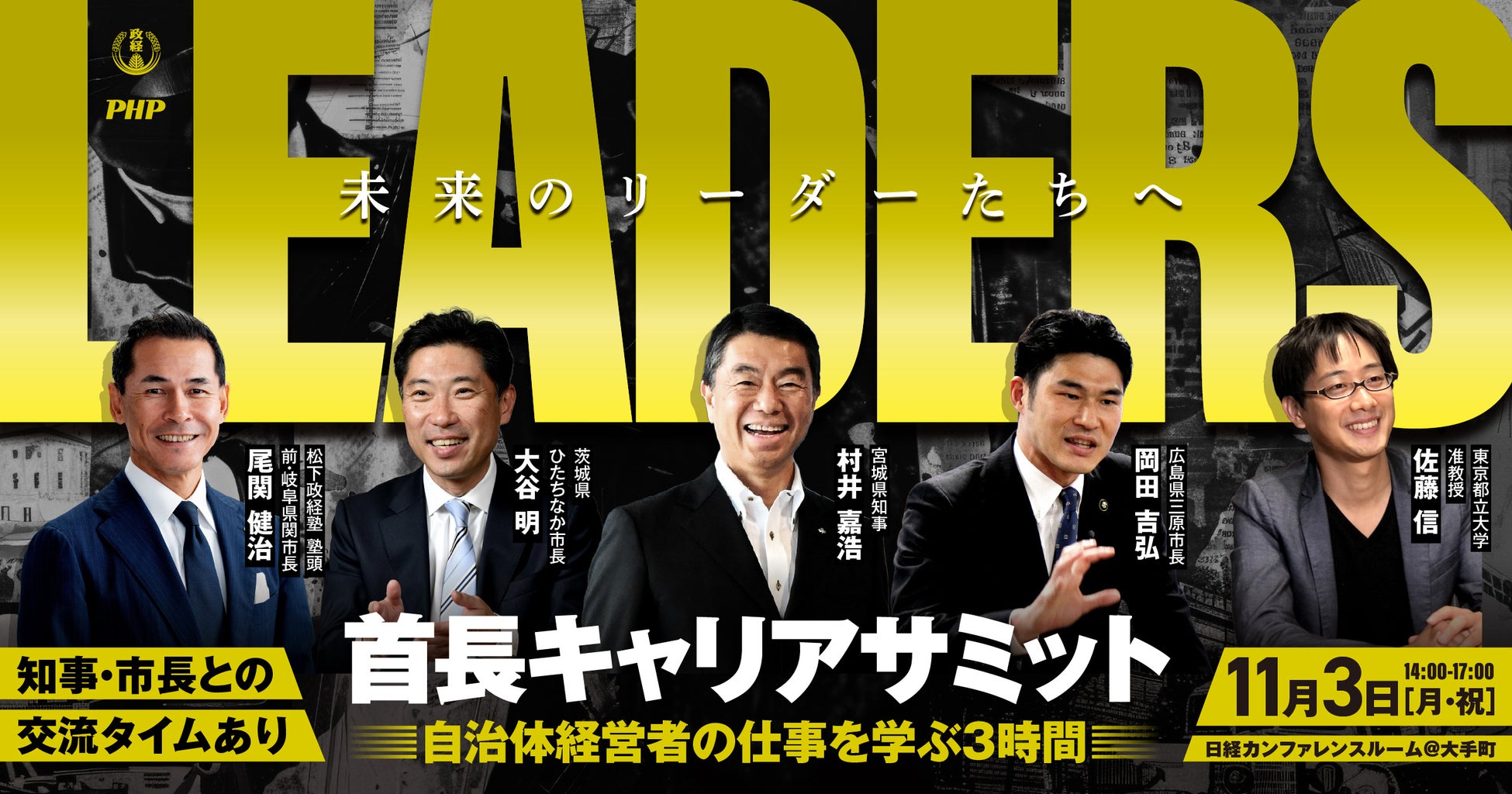 公益財団法人松下幸之助記念志財団 松下政経塾(塾長:遠山敬史、塾頭:尾関健治)と株式会社PHP研究所(代表取締役:瀬津要)は、2025年11月3日(月・祝)、日経カンファレンスルーム(東京都千代田区)にて、自治体経営者としての首長について学べる首長キャリアサミット「LEADERS(リーダーズ)」を開催します。
