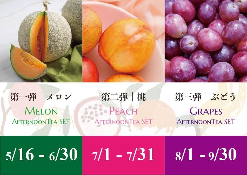 季節の果実「メロン・ピーチ・ぶどう」をテーマにした3種のアフタヌーンティーセットを楽しみながら集める『プレミアムスタンプラリー』を開催。すべてを集めていただいたお客様には、次回ご利用いただける「半額優待券」をプレゼント。