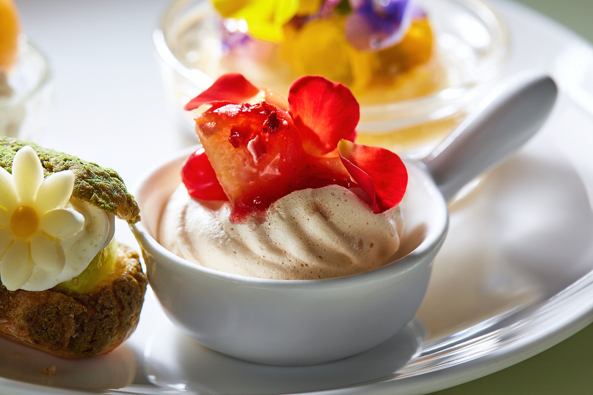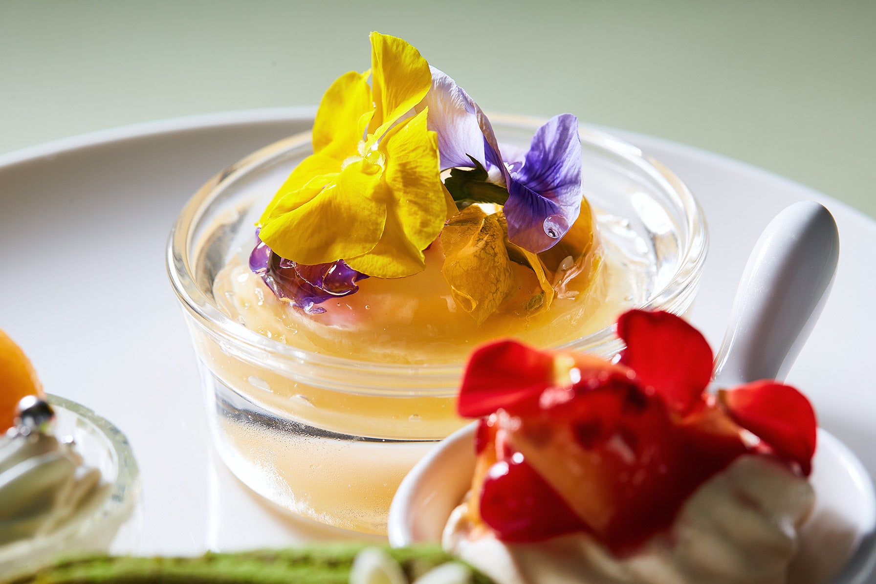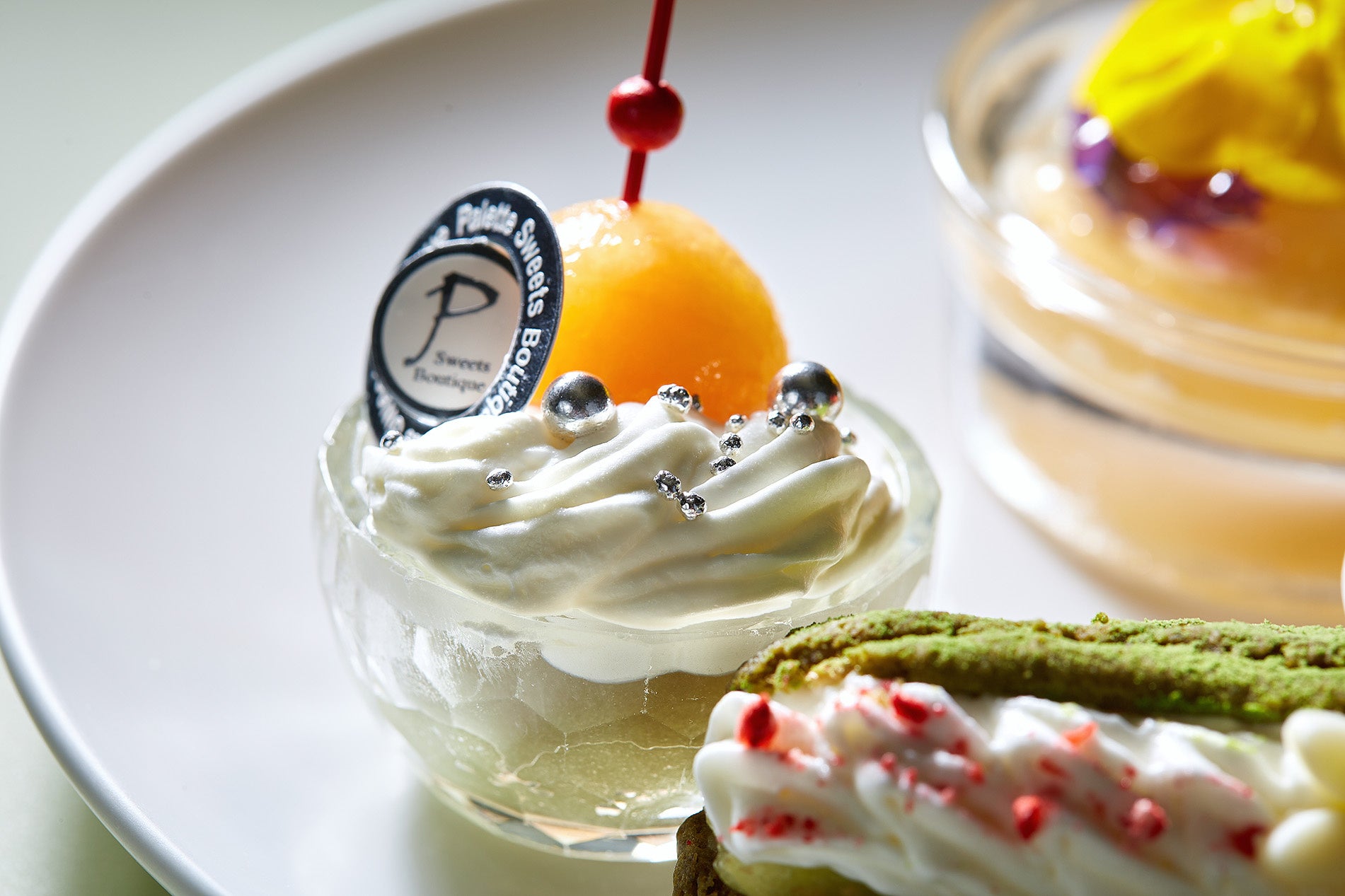 赤肉メロンの濃厚な甘みを優しく引き立てるパンナコッタとエルダーフラワー香るジュレが可憐なルックス。