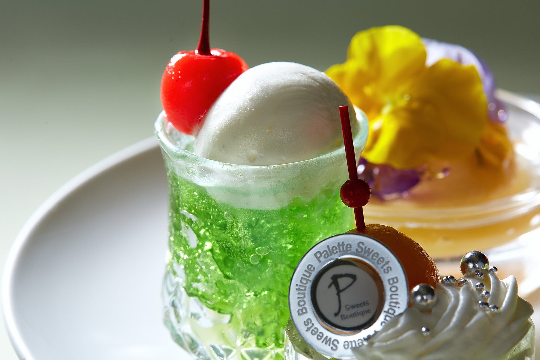 昭和レトロなメロンソーダを再現した爽やかな見た目と味わい。懐かしさと遊び心を添えた気分弾けるスイーツ。