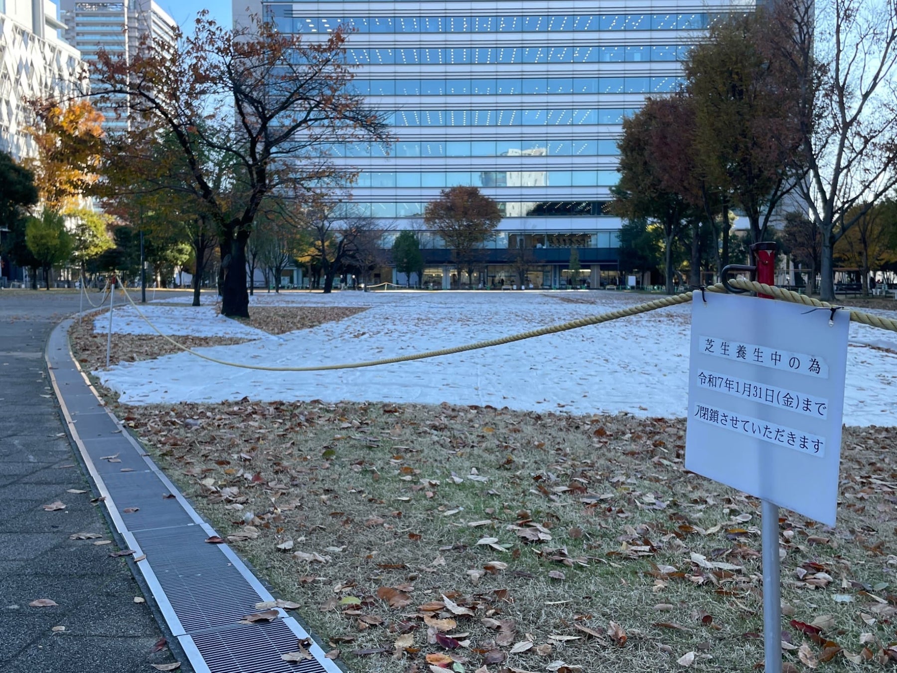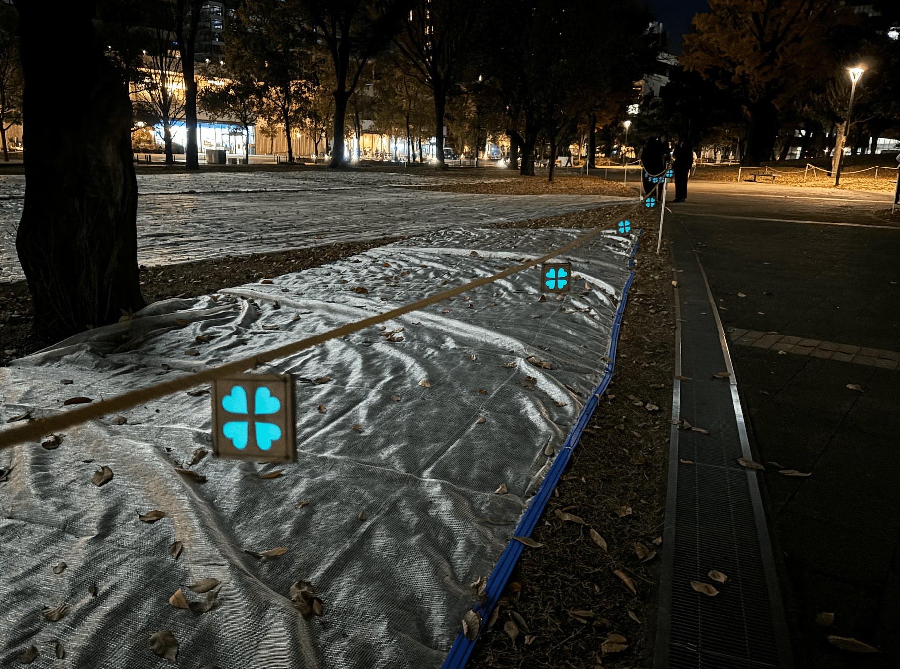 芝生保護用に設置されたロープに気づかず、夜間に引っかかる事故が発生している課題に対応するとともに、養生中の芝生エリアへの立ち入り防止を目的とした社会実験です。本実験では、高輝度蓄光ツールをロープに設置することで、暗闇でも視認しやすい安全対策を実現し、利用者の安心感を高めると同時に、芝生の保護を図ります。