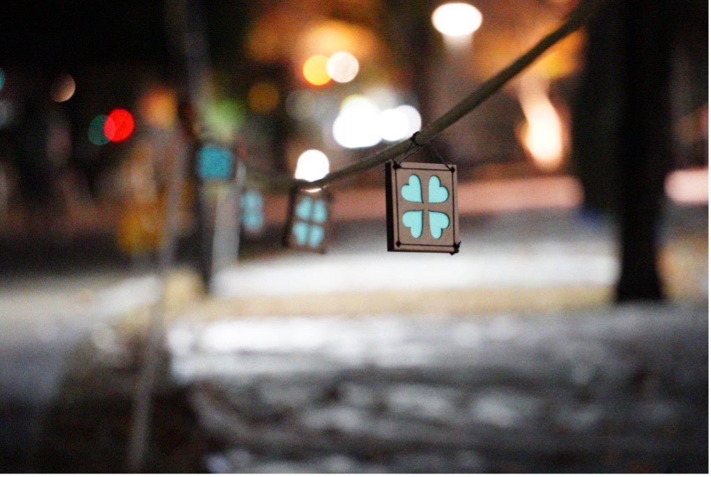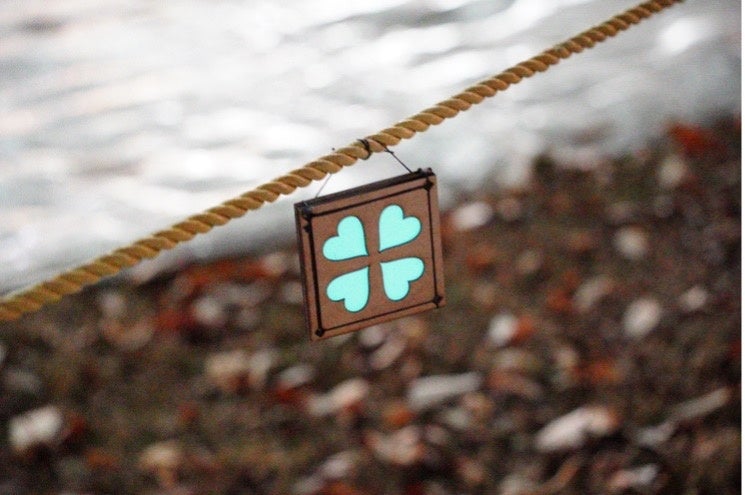 ・ロープに複数パターンの高輝度蓄光ツール『ナイトコンシェルジュ®️』の実験用マイクロユニットを取り付け、視認性向上効果を観察(写真はクローバータイプ)。