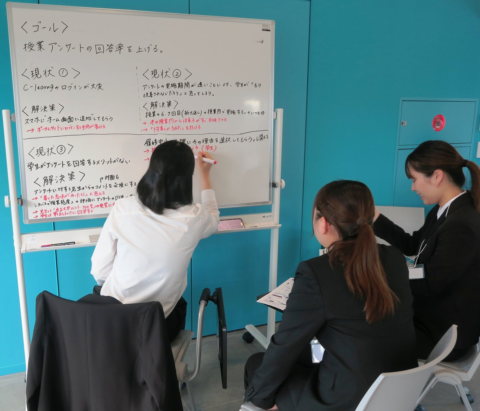 学事部では「授業アンケートの回答率向上」と「理想的な学内ツールの提案」というテーマが課されました。インターンシップ参加者は、学内ツールの改善や新機能の提案に取り組み、職員との対話を通じて、学生視点を反映した具体的な改善策を提示しました。