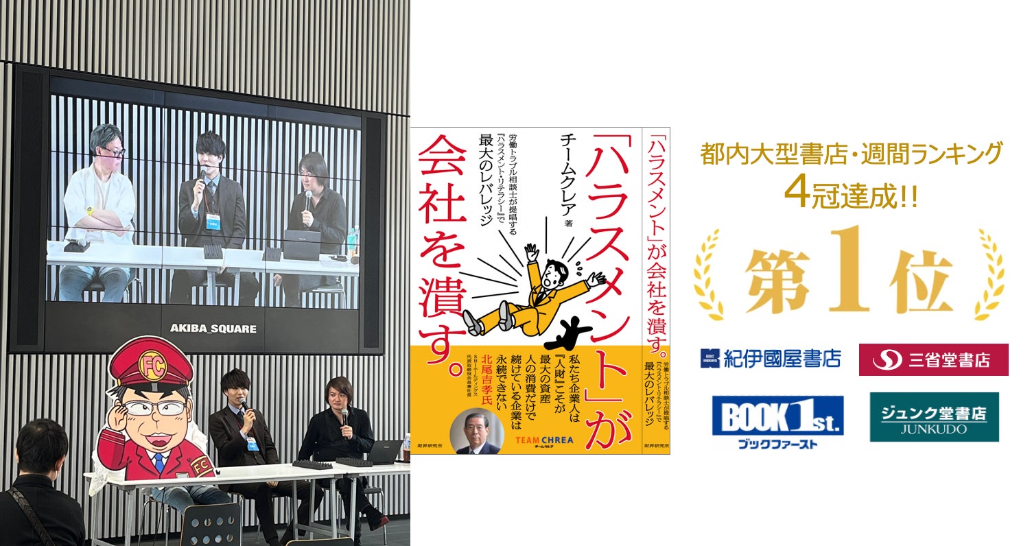 当日は、パワハラに関連するクイズを出題し、正解者にはチームクレア共著の執筆書籍をプレゼントする特別企画を実施しました。配布した書籍は、経営者のノーベル賞と称される財界研究所から出版した「ハラスメントが」会社を潰す。(チームクレア著)」で、大手書店の週間ランキングイベント1位を記録しています。15時からはステージ登壇し、加盟店検討者を含めた参加者との商談を行い、大盛況のうちにイベント終了となりました。