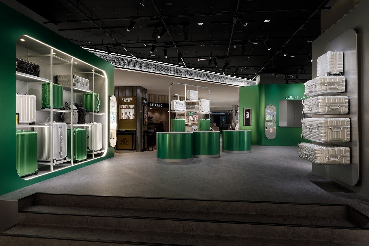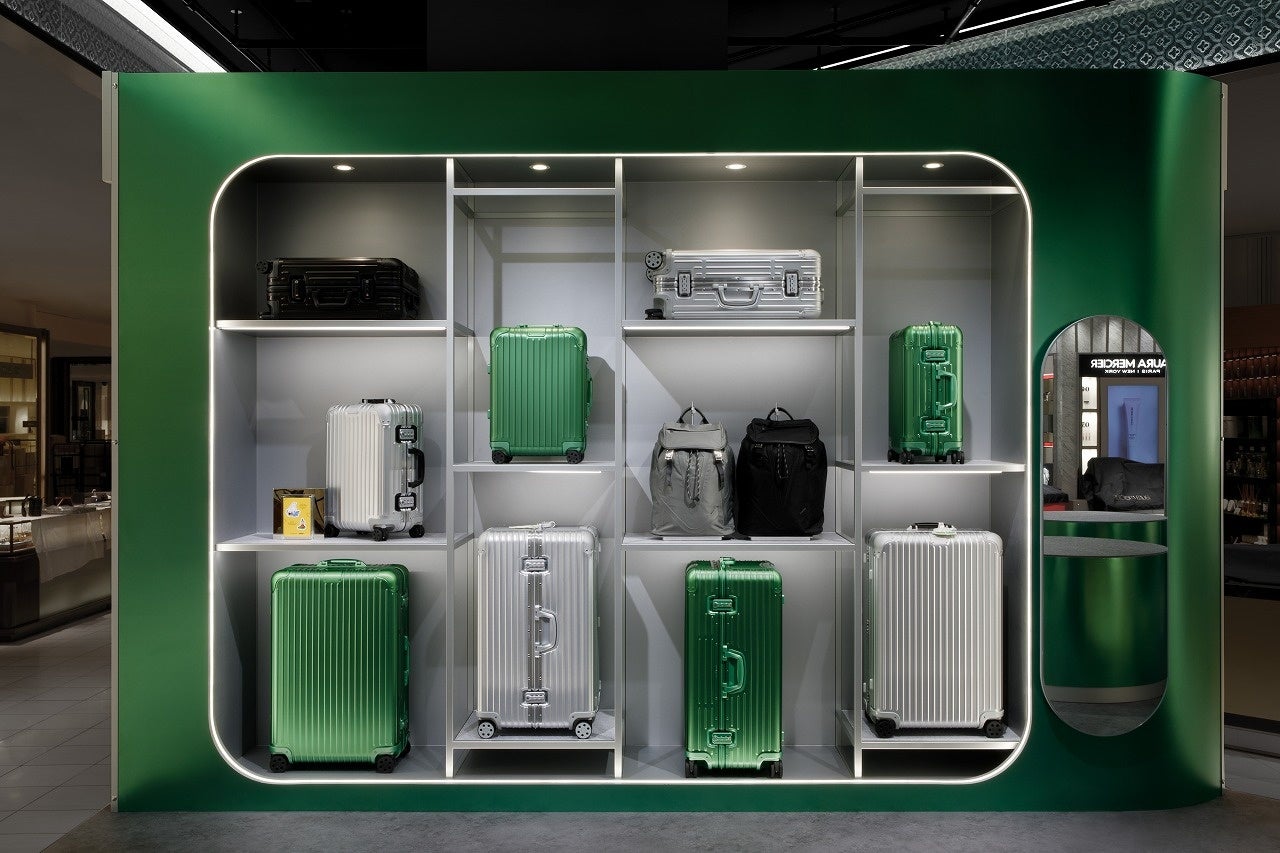 今回のポップアップイベントでは、RIMOWAを代表するアイテム「ORIGINAL」コレクションの最新シーズナルカラー「Emerald(エメラルド)」が世界に先駆け登場しています。イベント会場は、最新コレクションとリンクするようEmeraldカラーが用いられ、他のどのRIMOWA STOREとも異なる特別な空間に仕上げられました。