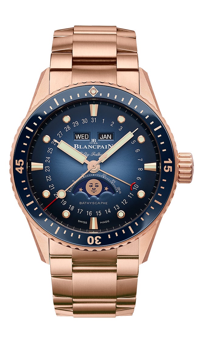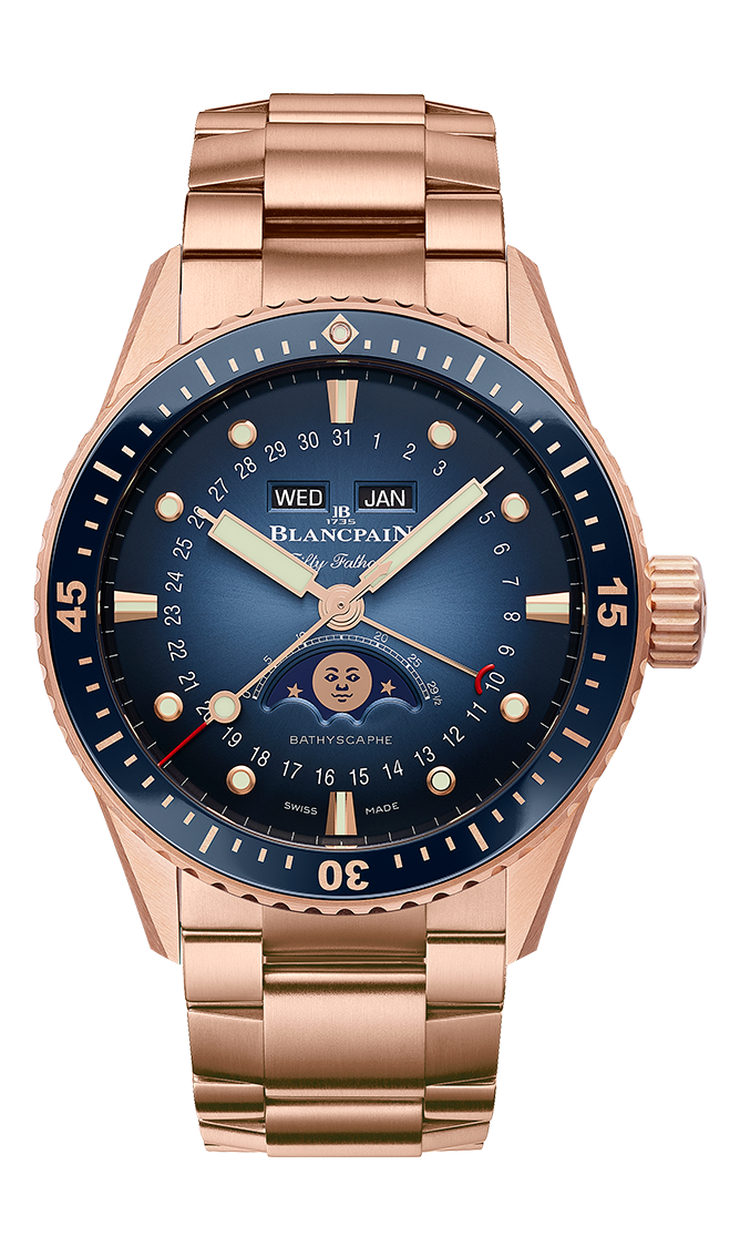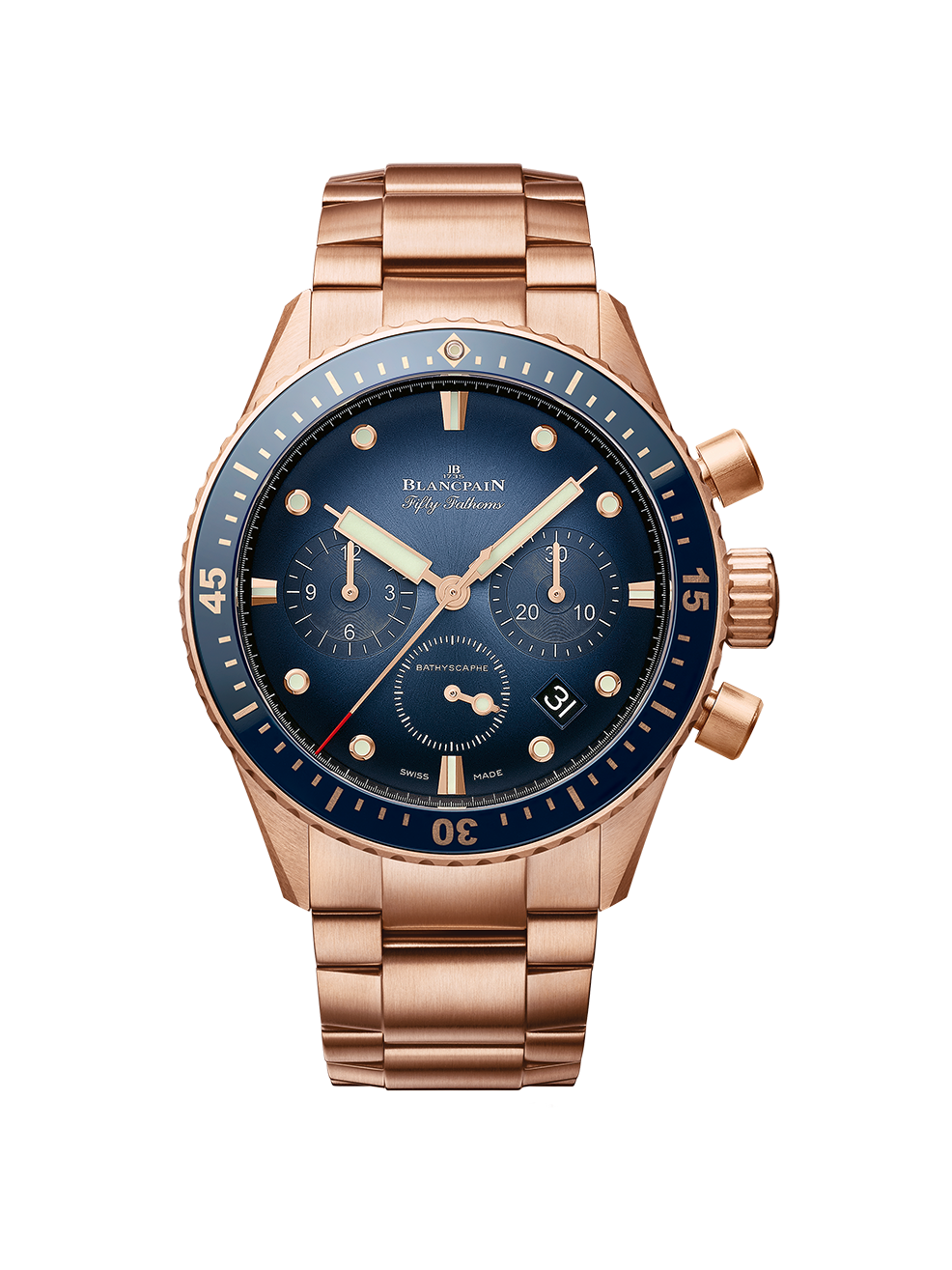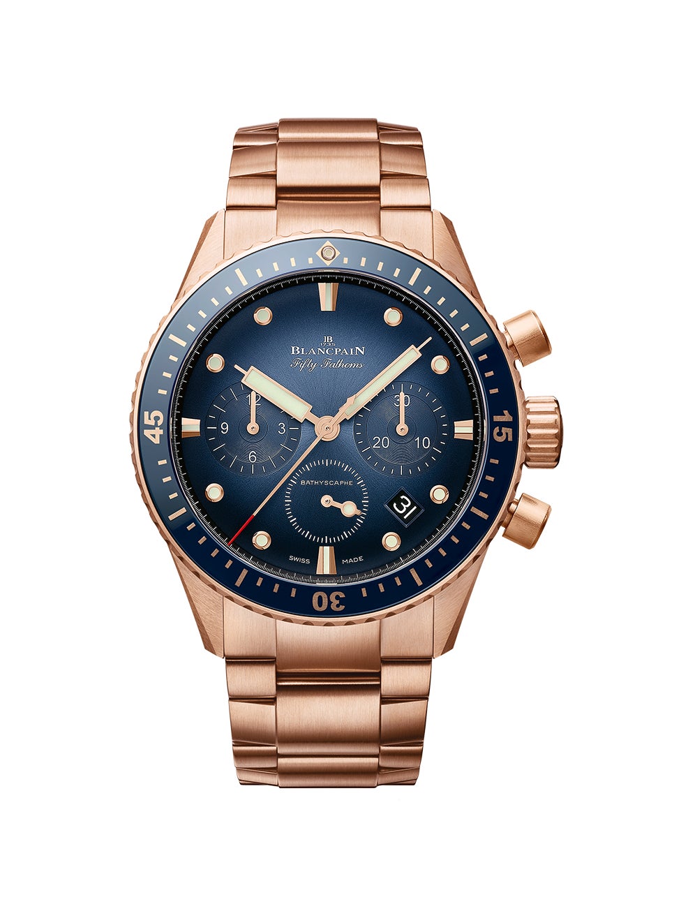 ブランパンは、バチスカーフ コンプリートカレンダーとクロノグラフ フライバック モデルをフルレッドゴールドで発表します。ケースとブレスレットを18Kレッドゴールドで丹精に作った印象的なタイムピースは、その豊かな色合いと堂々たる存在感で豪華さと壮大さを演出し、大胆にもその存在感を放っています。