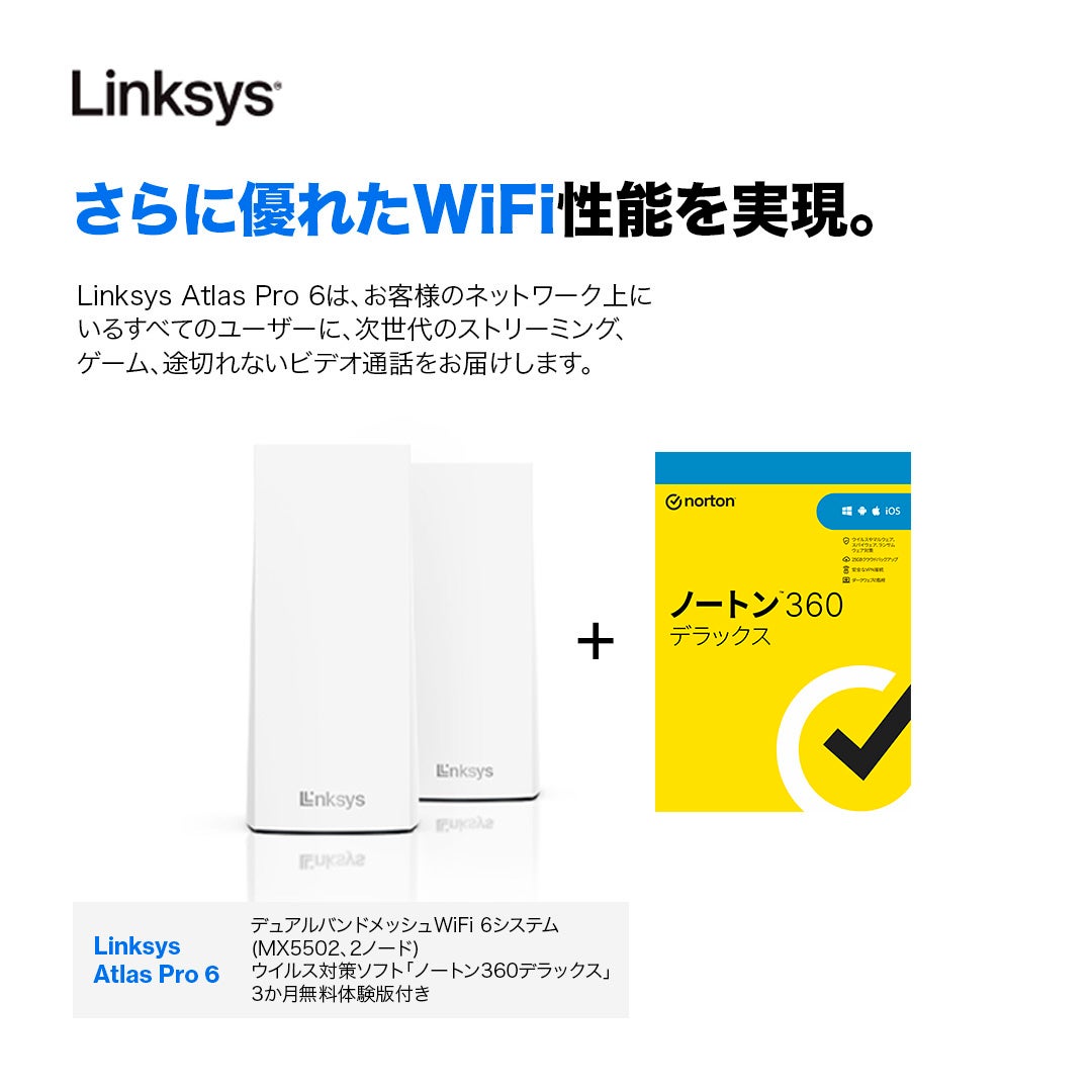 これらすべてが得られる機会を逃す手はありません。アマゾン限定のお買い得なLinksys Atlas Pro 6にアップグレードするとともに、特典として付属するノートン360 3カ月無料版でご自宅のセキュリティを強化しましょう。超高速で安定したWiFi接続と、ネット上の脅威からの保護が受けられるメリットを実感してください。単なるアップグレードを超えた、革新的なインターネット利用環境を実現します。また、現在のネット利用状況が変わるだけでなく、高速化とセキュリティ向上の相乗効果で将来の可能性も広がります。