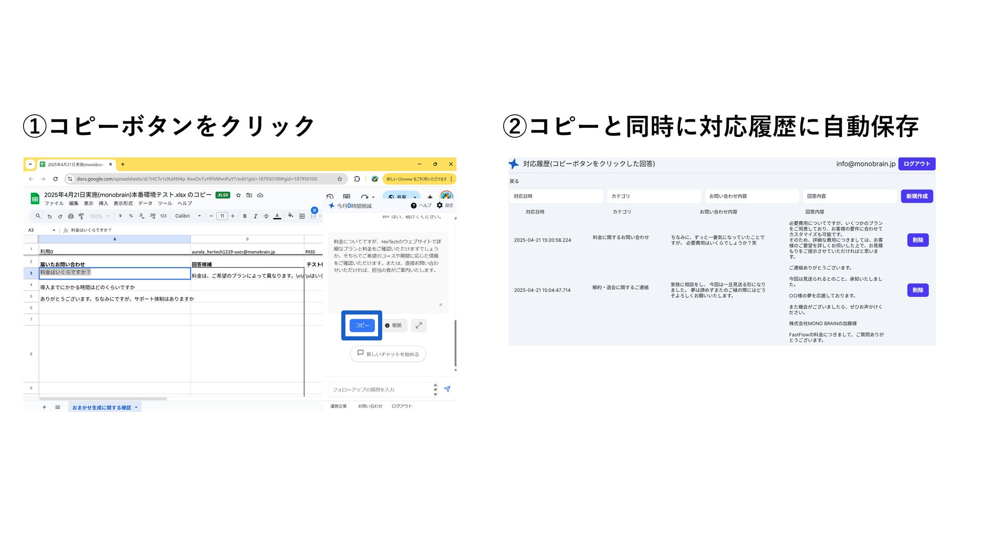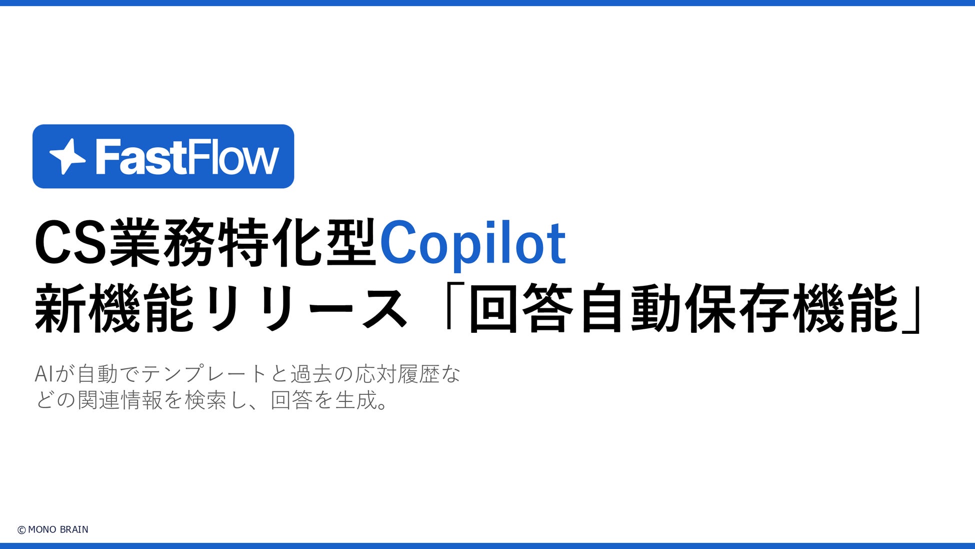 株式会社MONO BRAIN(本社:東京都渋谷区、代表取締役:加藤真規)は、CS業務特化型AI Copilot「FastFlow」に、オペレーターが顧客対応で使用するためにコピーした回答文を、自動で対応履歴データベースに保存する「回答自動保存機能」を追加したことをお知らせします。