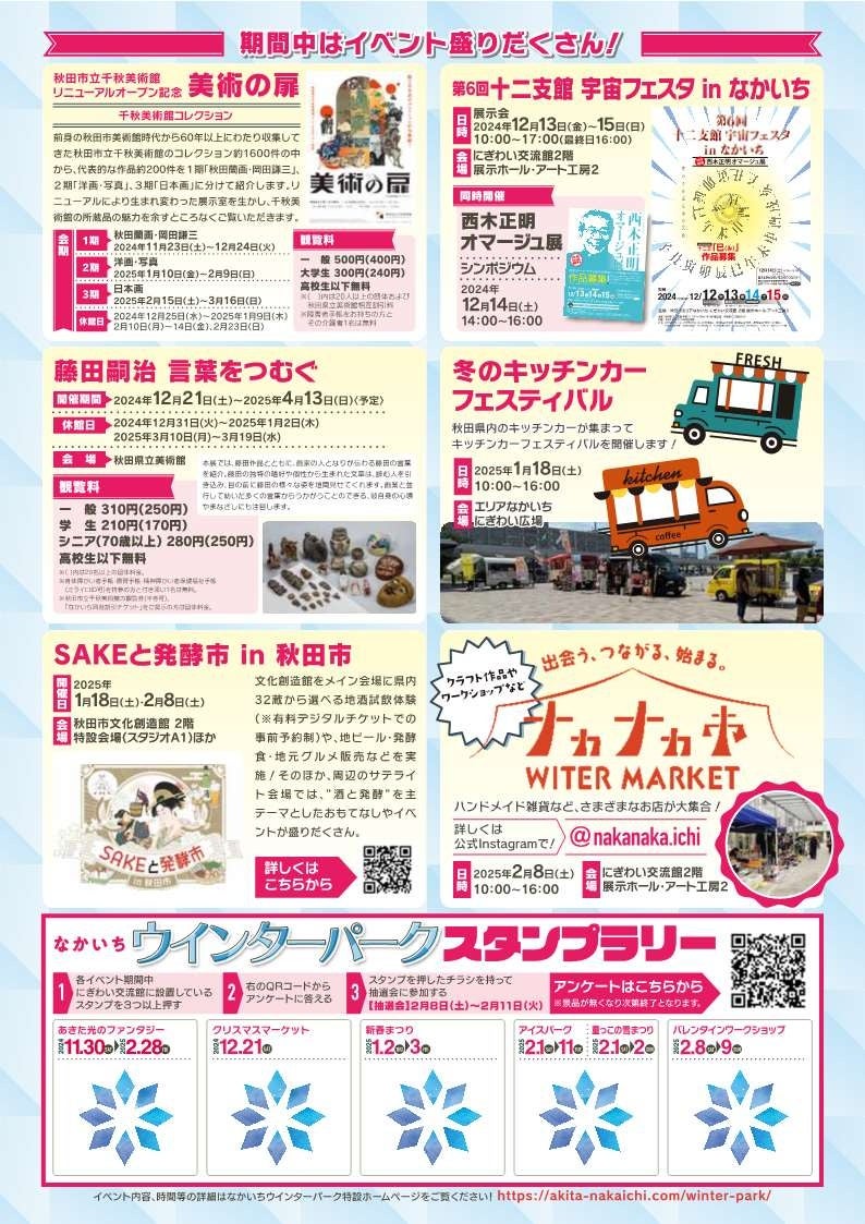 秋田の冬を彩る「なかいちウインターパーク」が今年も開催!鮮やかな光の演出が楽しめる「あきた光のファンタジー」のほか、クリスマスマやお正月、バレンタインなどにあわせた多彩なイベントが盛りだくさん!スタンプを集めてアンケートに回答するとバレンタインにちなんだ素敵な景品が当たるスタンプラリーも開催!