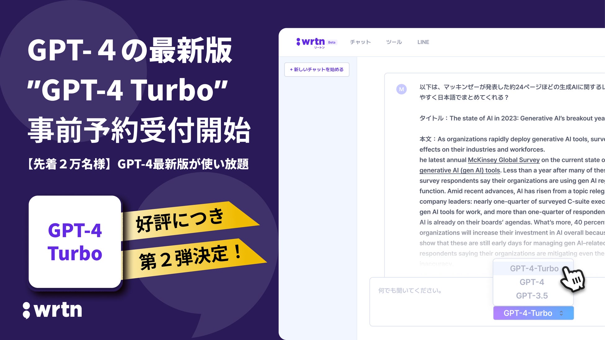 ・事前予約をした先着2万人限定で 「wrtn (リートン)Beta版」にて、 GPT-4 Turboを無料・無制限で提供します
