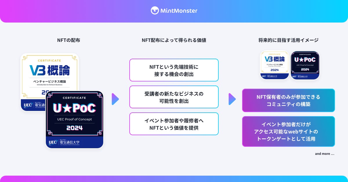 法人向けにWeb3ソリューションを展開する株式会社クリプトリエ(所在地:東京都中央区、代表取締役CEO:手塚康夫、以下クリプトリエ)は、国立大学法人電気通信大学(所在地:東京都調布市、以下電気通信大学)の講義「ベンチャービジネス概論」高木克人特任准教授と学生向けアイディア実証コンテスト「U☆PoC〜UECアイディア実証コンテスト〜」にNFT活用プラットフォームの「MintMonster(ミントモンスター)」の技術を活かしたサービスの構築を実施したことをお知らせいたします。