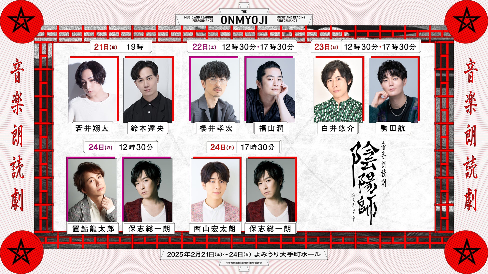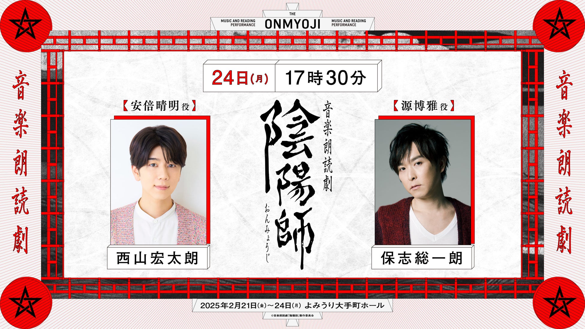 また本作は日替わりキャストで上演する。2月21日(金)は、前回に引き続き安倍晴明役を蒼井翔太、源博雅役を鈴木達央、2月22日(土)は安倍晴明役を櫻井孝宏、源博雅役を福山潤、2月23日(日)は安倍晴明役を白井悠介、源博雅役を駒田航、2月24日(月祝)は回替わりで、12:30回は安倍晴明役を置鮎龍太郎、源博雅役を保志総一朗、17:30回は安倍晴明役を西山宏太朗、源博雅役を昼に引き続いて保志総一朗が、それぞれ演じることが決定!