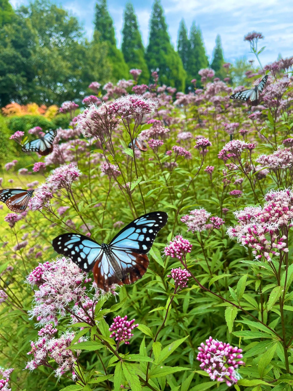 住む場所を変えながら長距離の移動「渡り」をすることで知られているアサギマダラ。9月下旬から園内に姿を現すようになり、10月中旬には南方へ姿を消します。クレマチスガーデンには、アサギマダラが好む花「フジバカマ」がありこれを目掛けてピークは数百頭が乱舞します。