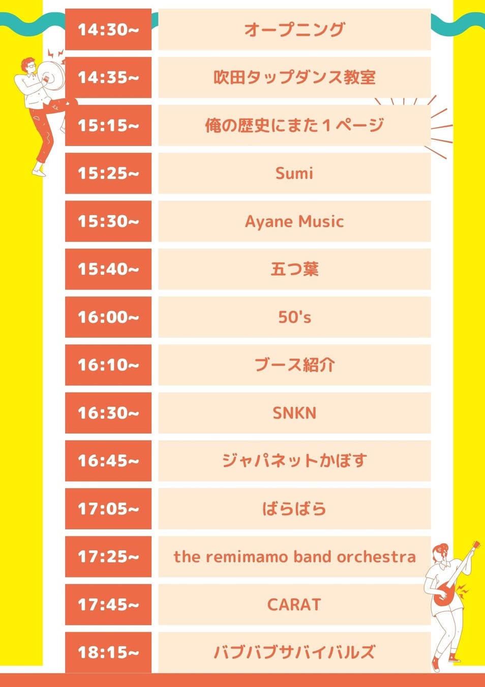 プログラム及び出店:フリースクールの子どもたちによるバンド演奏・カラオケ、フリースクールここ保護者のバンド「The remimamo band orchestra」、スタッフバンド演奏、ゴスペル、タップダンス
