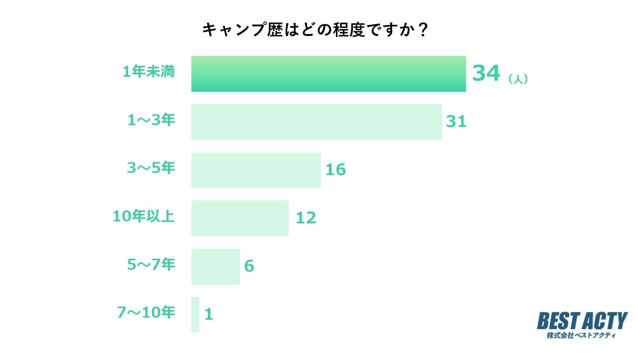 キャンプ歴について100人にアンケートを行ったところ、「1年未満」と回答する人が最も多い結果となりました。