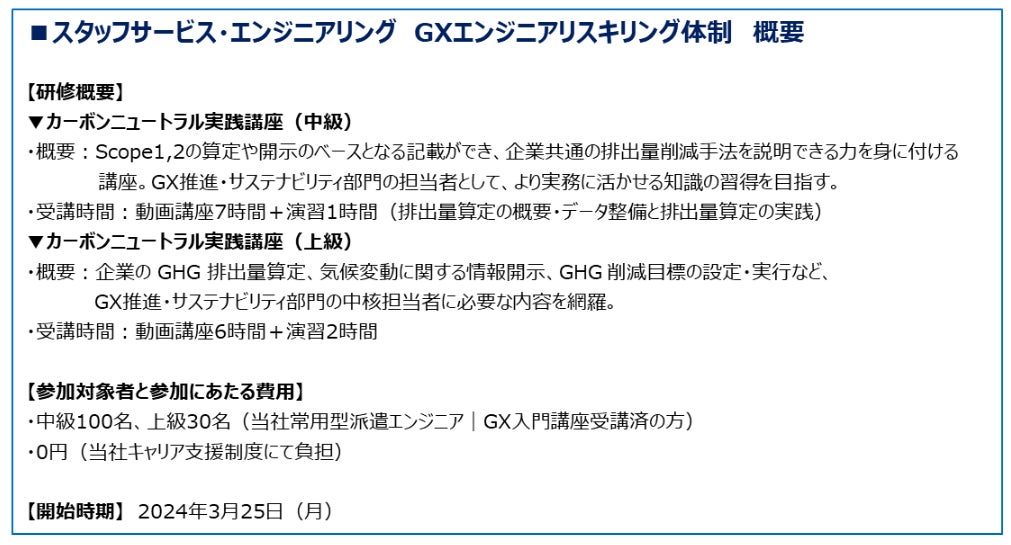 スタッフサービス・エンジニアリングでは、これまでも常用型派遣エンジニアを対象に、GXの基礎的なリテラシーの一つであるカーボンニュートラルの知識を習得できる「GX入門講座(「SkillUp Green」内)」を導入してきました。温室効果ガスの排出を全体としてゼロにする、カーボンニュートラル実現に向けた動きが活発化する昨今の社会動向を踏まえ、より一層エンジニアのGX分野のキャリア形成をおこなうとともに、GXエンジニアの人手不足を解消するため、上位レベルの講座を導入します。特に、エネルギー業界や自動車業界におけるCO2削減に向けた設計・開発や、GXによる新たなビジネスを推進するスキルを持つエンジニアを育成するとしています。