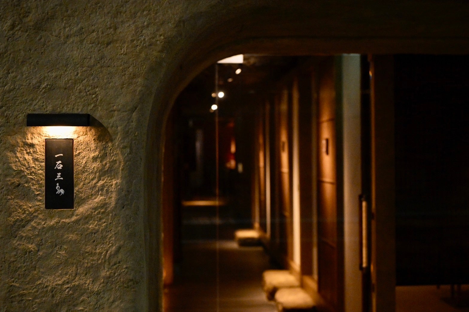 観光地の喧騒から少し離れ、隠れ家のような落ち着いた雰囲気でお食事をお楽しみいただけます。照明の明るさを落とし高級感が漂う店内には、シェフを囲むように配置したカウンター席や障子で仕切られた個室をご用意しております。カウンター席では、目の前で繰り広げられるシェフの匠の技を見ながら料理を味わい、五感で食のライブパフォーマンスをご体験いただけます。一石三鳥グループは、デートや接待など大切な方をエスコート する際にご利用されるお客様が多く、オーナーを筆頭にブライダル業界出身のスタッフによる“おもてなし”の接客も高い評価をいただいています。