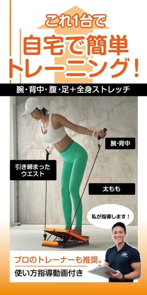 これ一台で様々なトレーニングを行えるので、ジムに行けない日も自宅で効率的にシェイプアップ・ボディメイクが可能です。コンパクトで収納性もあるので、場所を取らずにすぐに使えるのも大きな利点です。