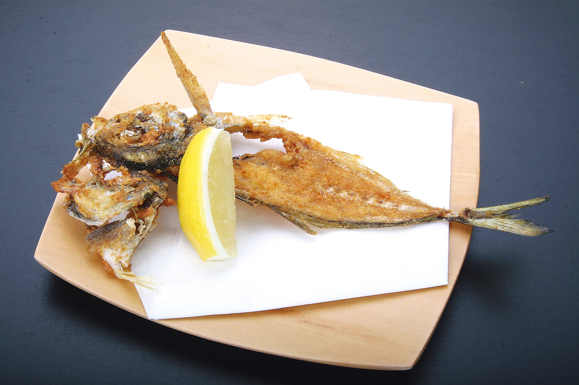 名物:泳がし鯵一匹にぎり。活きのよい姿づくりで盛り付け、お食事後は骨せんべいにして提供いたします。