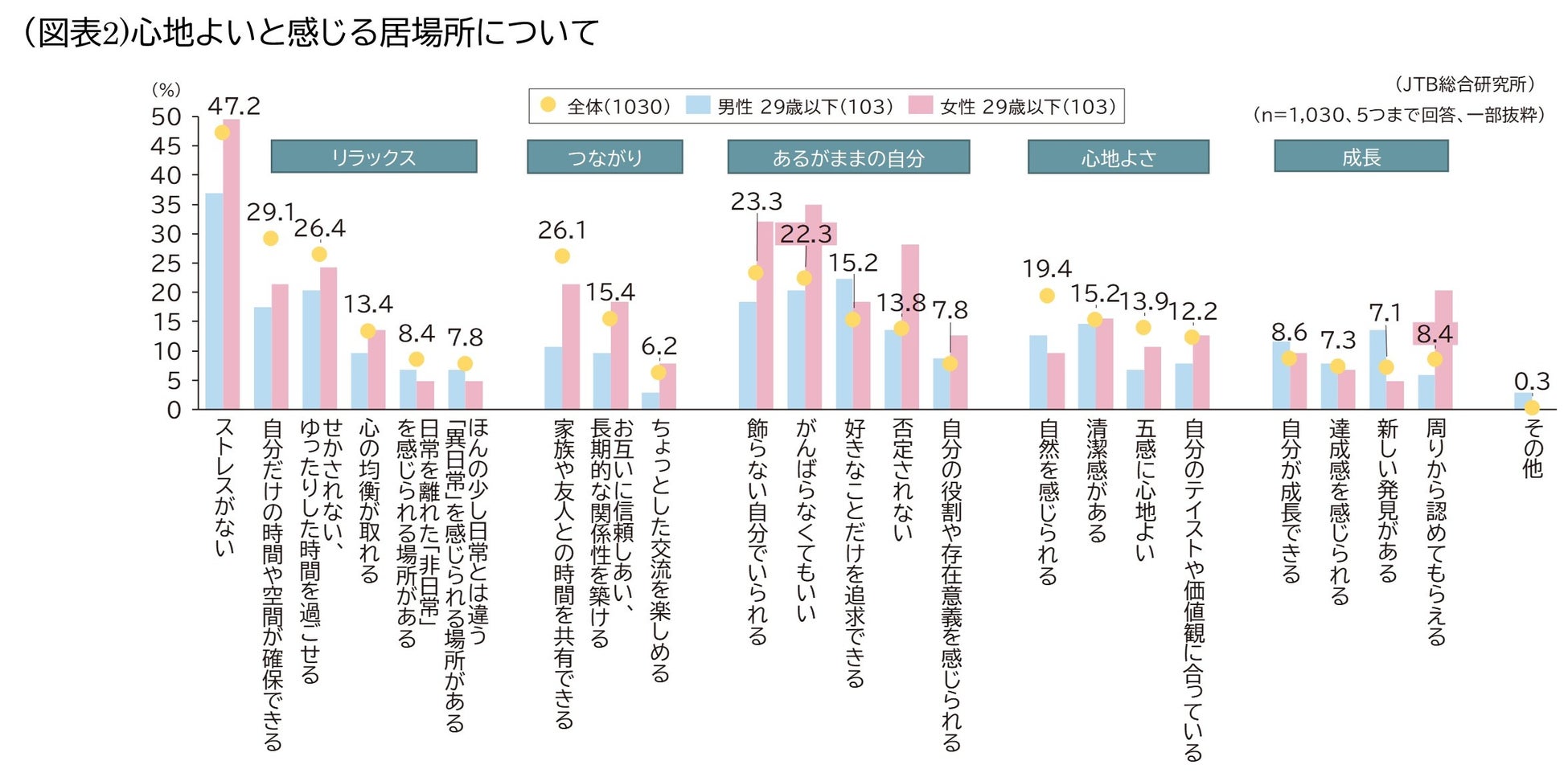 また心地よいと感じる居場所については、男性29歳以下は「好きなことだけを追求できる(22.3%)」、「新しい発見がある(13.6%)」、が全属性の中で最も高く、女性29歳以下は「がんばらなくてもいい(35.0%)」、「否定されない(28.2%)」、「周りから認めてもらえる(20.4%)」が特に全体より高い結果となりました。Z世代の女性にとっては、ありのままの自分を認められることが心地よさに重要と考えられます(図表2)。