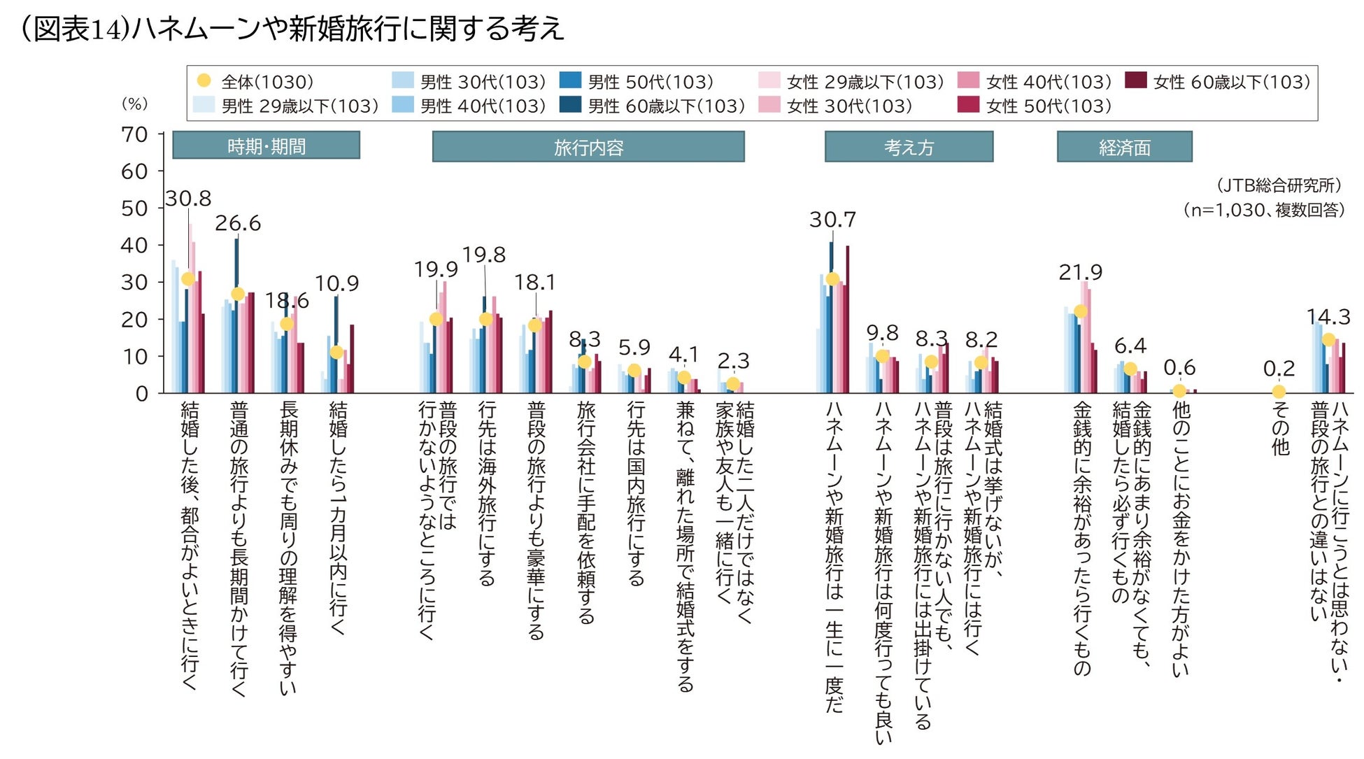 またハネムーンや新婚旅行については「結婚したら1か月以内に行く」について男性60歳以上が26.2%であるのに対し、男性29歳以下は5.8%。「ハネムーンや新婚旅行は一生に一度だ」については男性60歳以上が40.8%であるのに対し、男性29歳以下は17.5%など、変化する価値観と世代のギャップが明らかになりました(図表14)。