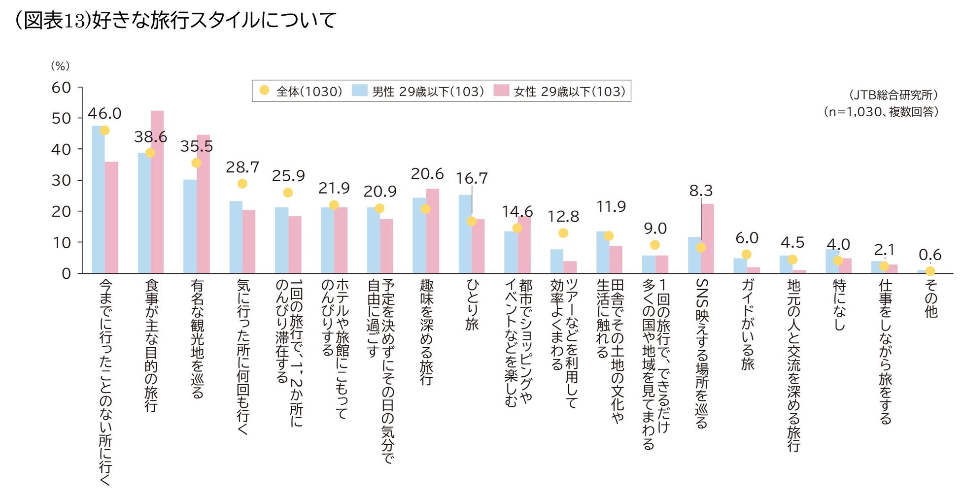 「SNS映えする場所を巡る」は男女29歳以下共通で高いですが、特に女性に強い傾向が見られます(図表13)。