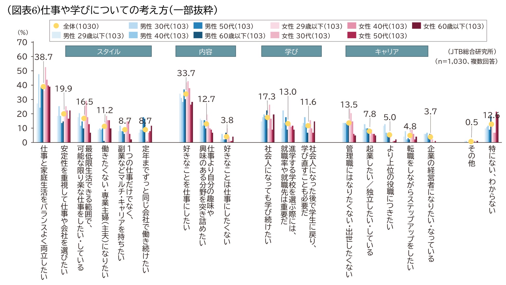また女性29歳以下に女性30代加えた傾向として、「定年までずっと同じ会社で働き続けたい」が低く、「転職をしながらステップアップしたい」が全属性の中で最も高い結果となりました。加えて「一つの仕事だけでなく、副業などマルチ・キャリアを持ちたい」も他の属性に比べ高い傾向となりました。また「起業したい/独立したい・している(12.6%)」が男性30代で最も高い結果となりました。Z世代とその上の30代を中心に、働き方の自由度が増し、転職や副業、起業などを意識している層が増えている様子がうかがえます(図表6)。
