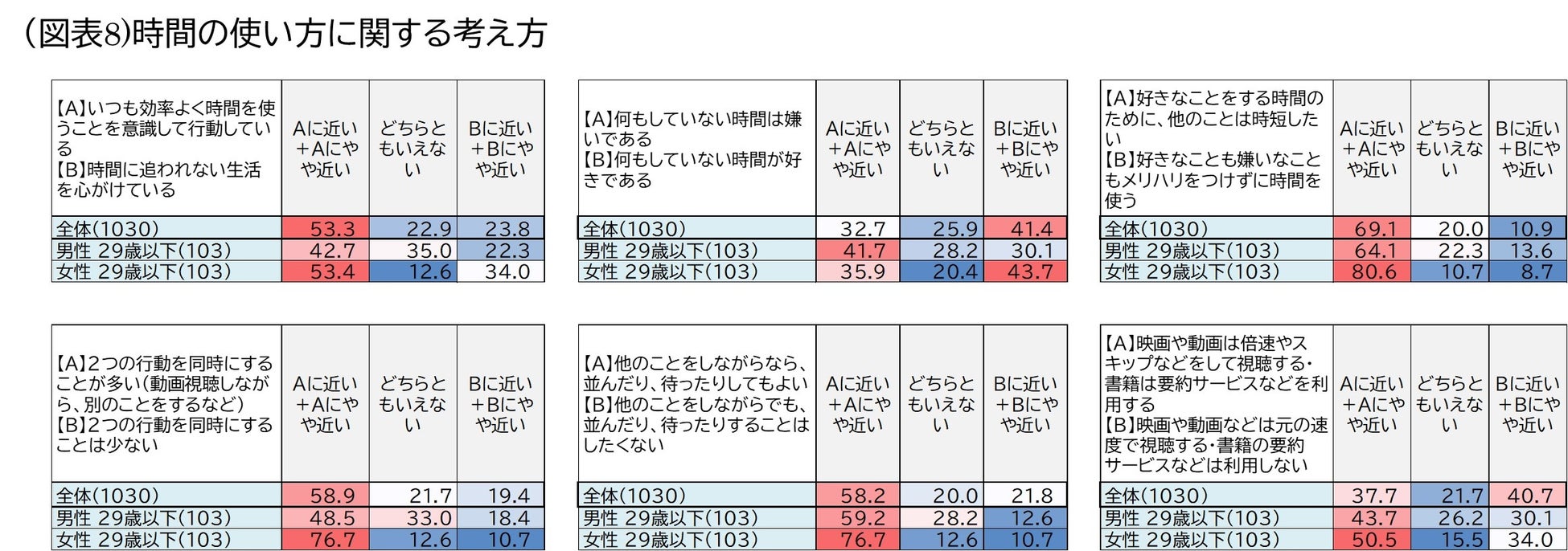 時間の使い方に関する考え方では、男性29歳以下では「何もしていない時間は嫌いである(41.7%)」、「映画や動画は倍速やスキップなどをして視聴する・書籍は要約サービスなどを利用する(43.7%)」の項目で、全体より高い傾向が見られました。女性29歳以下では「好きなことをする時間のために、他のことは時短したい(80.6%)」、「2つの行動を同時にすることが多い(76.7%)」、「他のことをしながらなら、並んだり、待ったりしてもよい(76.7%)」、「映画や動画は倍速やスキップなどをして視聴する・書籍は要約サービスなどを利用する(50.5%)」で全体より高い傾向が見られました。男性以上に女性の方が、時間を有効活用するためのタイパ行動をより取り入れている様子がうかがえます。一方、女性29歳以下は「時間に追われない生活を心がけている(34.0%)」が全体よりも高く、メリハリをつけている様子もうかがえます(図表8)。